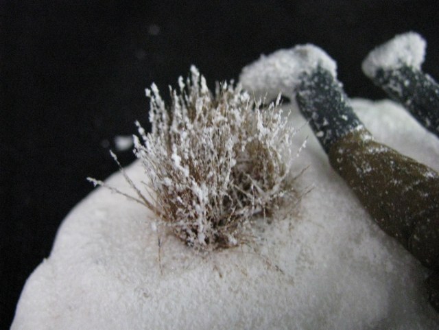Начну из далека: примерно где-то в марте-апреле нас с классом возили на профориентацию в ГОИ (Гос. Оптический Институт), ну и в качестве сувенира я спёр оттуда ещё неотшлифованную линзу. Вот. Это и есть основа. Дольше я её покрыл снегом (ПВА+сода) в два слоя, добавил кустик и бочку от Восточного Экспресса. Для эффекта только выпадшего снега, или даже идушего на этот момент, немного пшикнул из аэрозоля "Снежная пыль", который валяется с Нового Года.