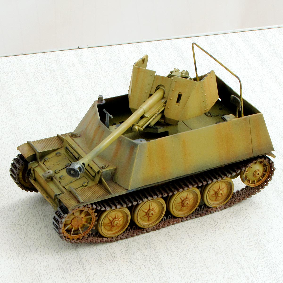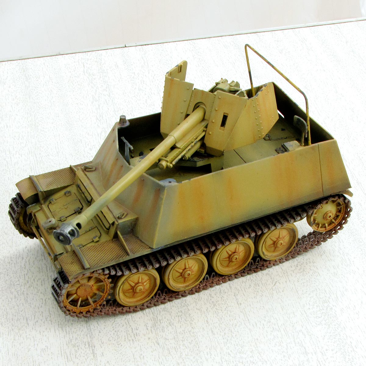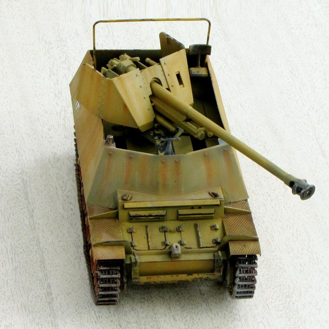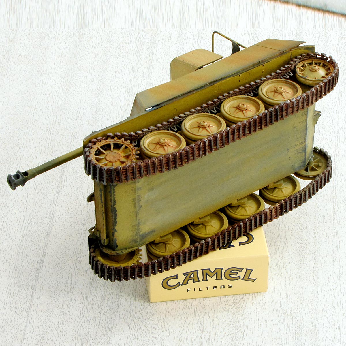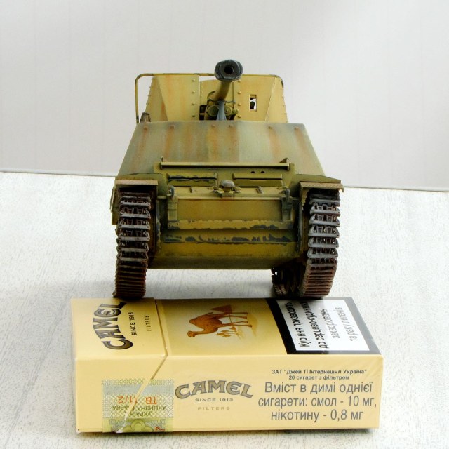 А бандажи то почему не черные? Даже если допустить что при перекраске в полевых условиях, они были закрашены, но почему и со внутренней стороны они желтые? На гусеницах нет дорожек от звездочки и ленивца, и обтереть казенник, как и всю внутренность рубки до железа, ну и на мой вкус грязи маловато, а так симпатичный самоходик.