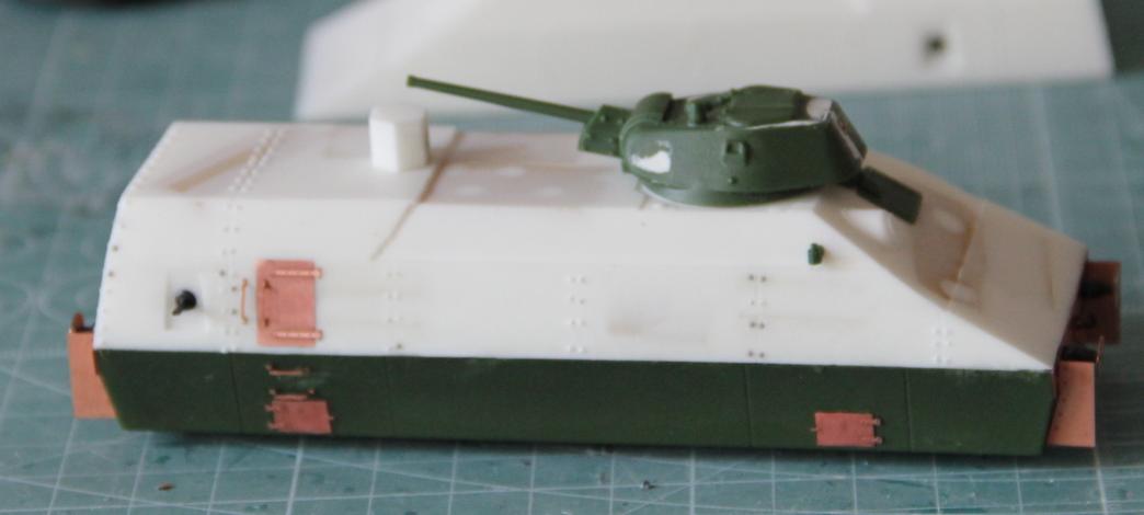 2.В процессе изучения фотографий на одном из вагонов явно виден триплекс на люке механика водителя. Был срезан смоляной люк и с пластикового Т-34 (башня которого ушла на Минина) был поставлен пластиковый люк.