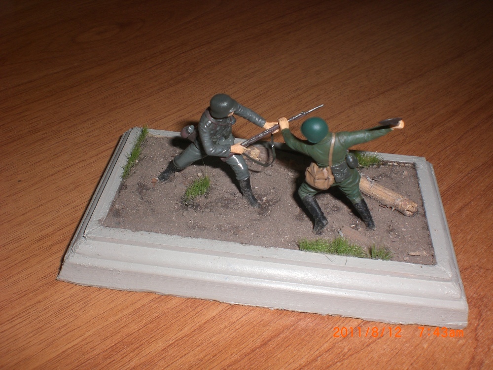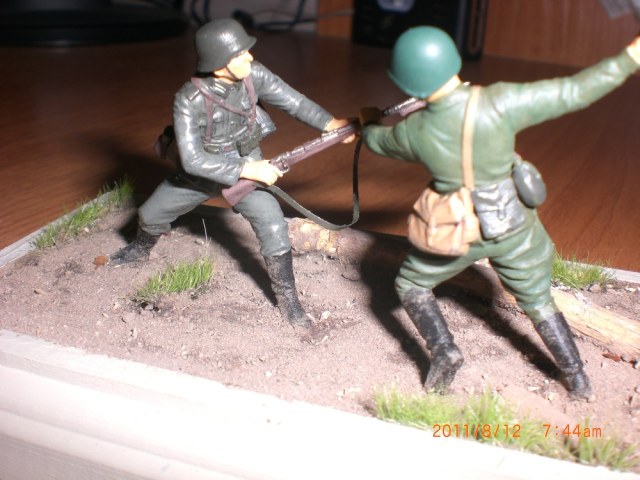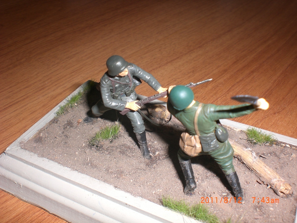 в цвет формы красноармейца не попал...каска тоже ядовито зеленая...у немчика приклад,портупея,фляга все в одной цветовой гамме непонятной...лица отсутствуют