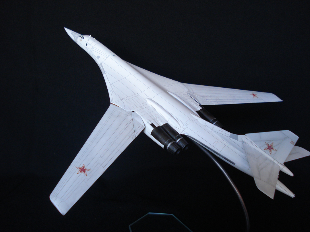 самые первые ту-160 отправляли в прилуки, там все начиналось: освоение машины летчиками, первый пуск ракеты и т.д. но развал ссср пагубно отразился на самолетах. после того, как ту-160 перешли в собственность украины, полеты сократились до 5-и раз в год, самолеты гнили на стоянке. в итоге решили совместно с американцами их уничтожить. может борта №33 вообще нет, тем кому повезло, сейчас базируются в Энгельсе. эта авиационная драмма могла лечь в основу хорошего фильма. хотел сделать хорошую модель для себя. в ходе работы решил кое-где перерезать крой, но это оказалось не легко, хоть и сделал скрайбер из ножов. полотна. проблема в том, что все равно остается рваный, не ровный след, да и мелкие элементы кроя не удавалось прорезать аккуратно, особенно если у них форма эллипса. вообщем модель себе не оставлю, т.к. конечный результат мне не понравился, думаю trumpeter будет лучше.