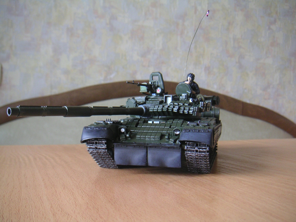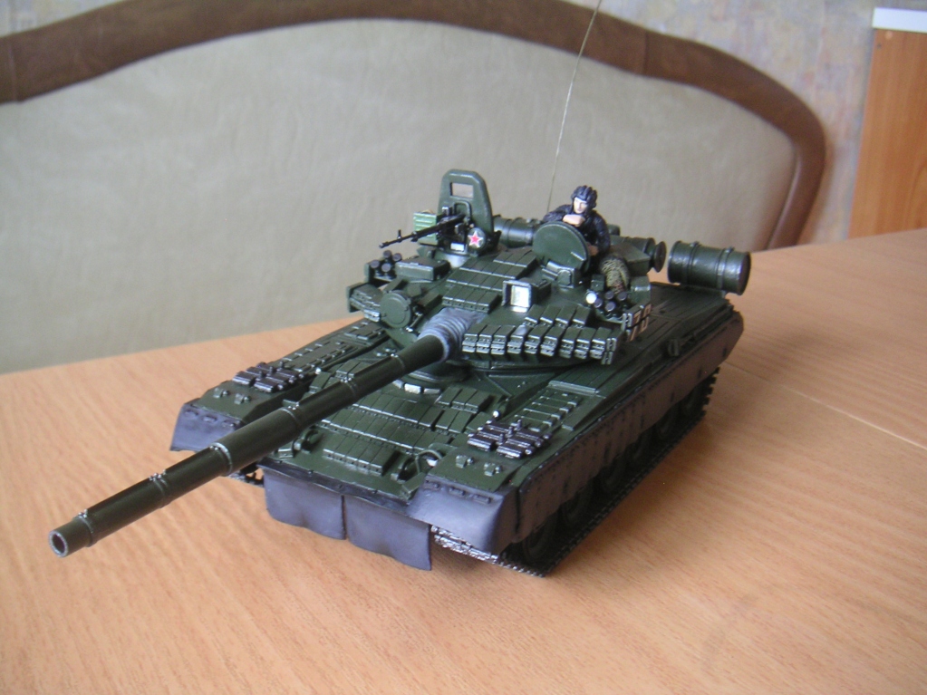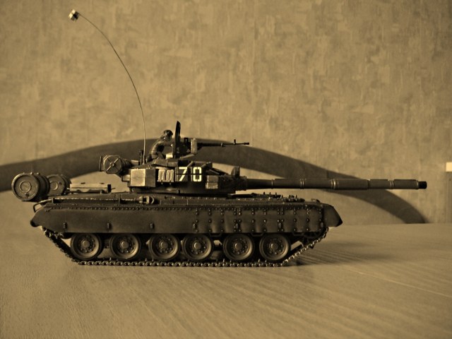 Всем привет! Выкладываю свой первый танк Т-80бв, до него ещё ни разу не собирал эту технику. В сборке затруднения были только с установкой брони. Модель красилась из баллончика от тамии(первый опыт, краска просто супер). Применял сухую кисть, боялся переборщить. Ещё сделал тонировку маслом(совсем немного). Также добавил скатку из марли и самодельный ящик из линейки. Остекление делал из DVD диска.