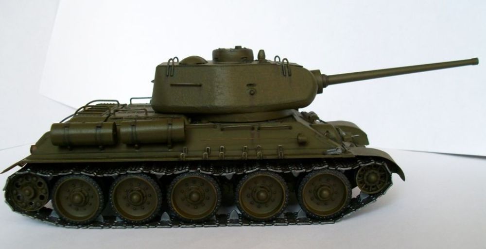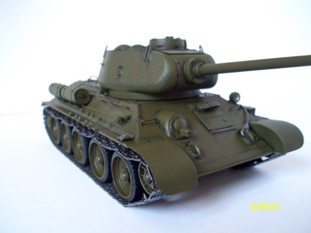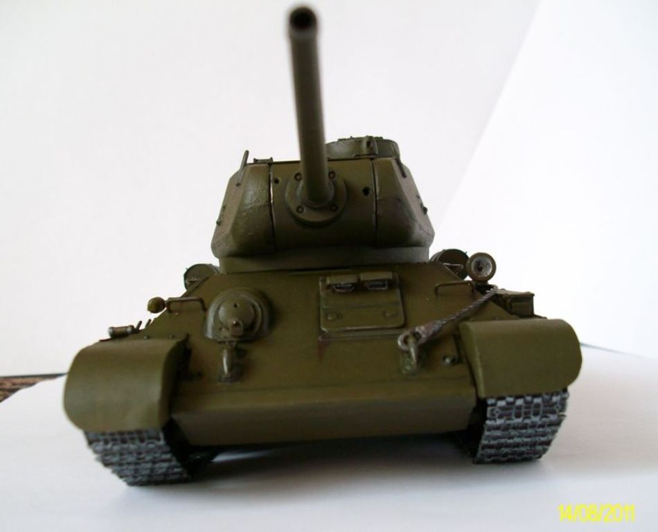 выставляю свою очередную модель. Собирал с мая 2011 года. Сборка мне понравилась. Из своего добавил: имитацию литья башни с помощью шпаклевки; немного переделал командирскую башенку; пулемет из иголки шприца; тросс - металлическая растяжка из хоз товаров; передние крылья из жести; сетка МТО из заварного ситечка; рассверлил выхлопные патрубки; скатка из обувной бумаги и клея; поручни на крышке МТО.