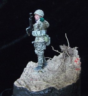 исполнение хорошее, но вот матчасть -полное несоответствие, говорю как человек служивший в армии Израиля, начнем с того, что ни один Израильский офицер никогда бы не повязал на шею арафатку,во первых по идеологическим соображениям, во вторых выше стоящее начальство просто не позволит, цвет формы не соответствует действительности- цвет должен быть олив драб, разгрузка- за 3 года службы ни разу не встречал подобной, даже из тех, что были сшиты на заказ, винтовка - модификацией М16А1/А2 офицеров не вооружают уже лет как 20 даже резервистов- должен быть М16А1/А2 карабин или А4, с уважением)))