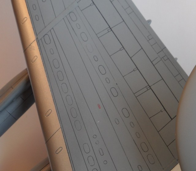 Стабилизатор стоит ровно- он кстати просто одет и не приклеен, киль отлит заодно с фюзелем и строго вертикально, поэтому я как говорится за стабилизатор отвечаю). По расшивке- можно было выделить светлее как например на ту 160, но тогда на сером пришлось бы выделять более темной- двухцветная расшивка это както неахти, кроме того она у амодел очень широкая и потому столь жирный эффект. Провис, его задает Амодел , можно конечно пилить и рубить , но я считаю что это глупо мне эти мелочи неважны, тк я свои модели не вгоняю в чертежи мне достаточно сходства с прототипом, вот и фото провиса.