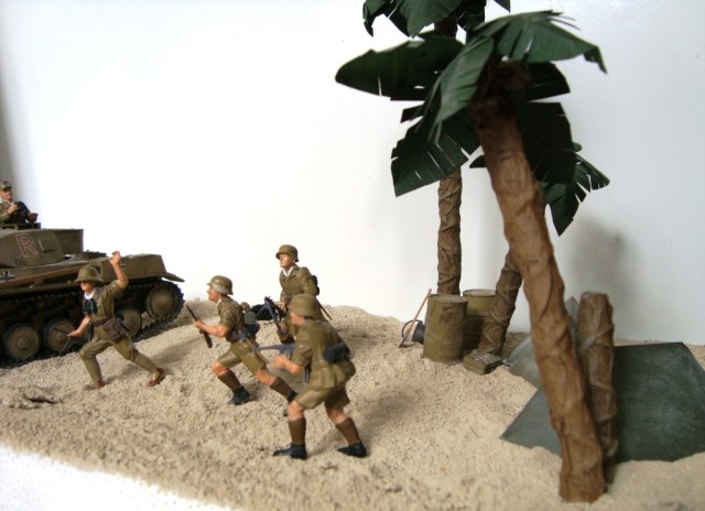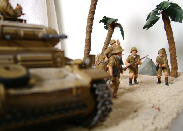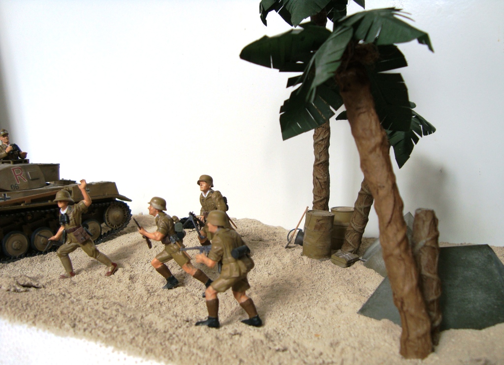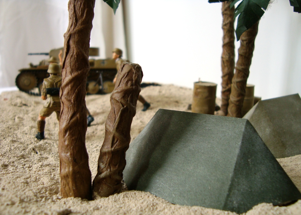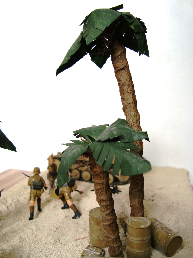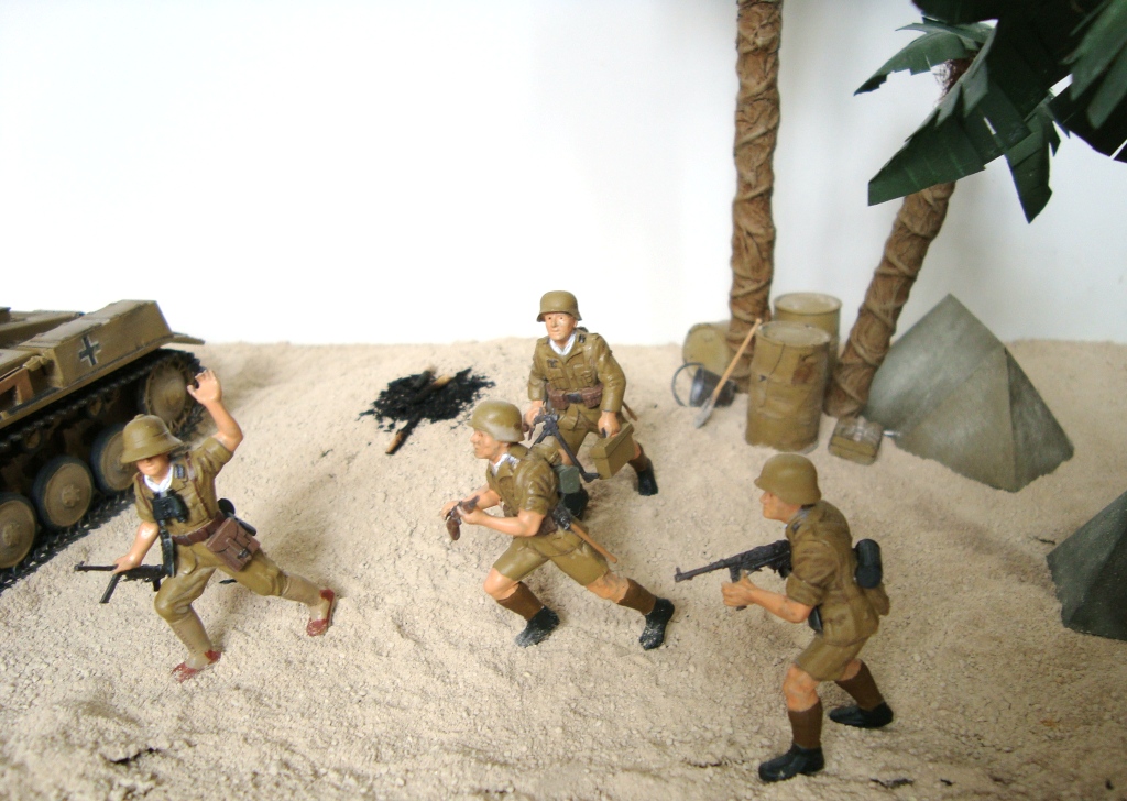 Африканский корпус, был выбран мною из-за того что мне очень нравится Роммель как полкводец и стратег, вот и было принято мною решение первую диораму посвятить боевым действим в Африке. Сюжт диорамы п моему замыслу таков: Раньнее утро, солдаты проснувшись отдыхают в тени пальм и тут подезжает танк и командиром танка был передан приказ на построение, для получения боевой задачи, солдаты хватают оружие и бегом следуют к месту построения.