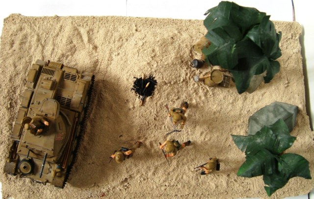 Композиции не хватает реализма: просто куча песка с тремя картонными пальмами, и чем то похожим на палатки. Без обид, я сам когда попробовал строить диораму - понял какой это колоссальный труд (учесть все мелочи, при этом надо достойно окрасить технику и фигуры), тогда я бросил эту затею, решил ещё попрактиковаться с отдельными моделями. Вам респект за пробу, всё же: "Всё приходит с опытом"