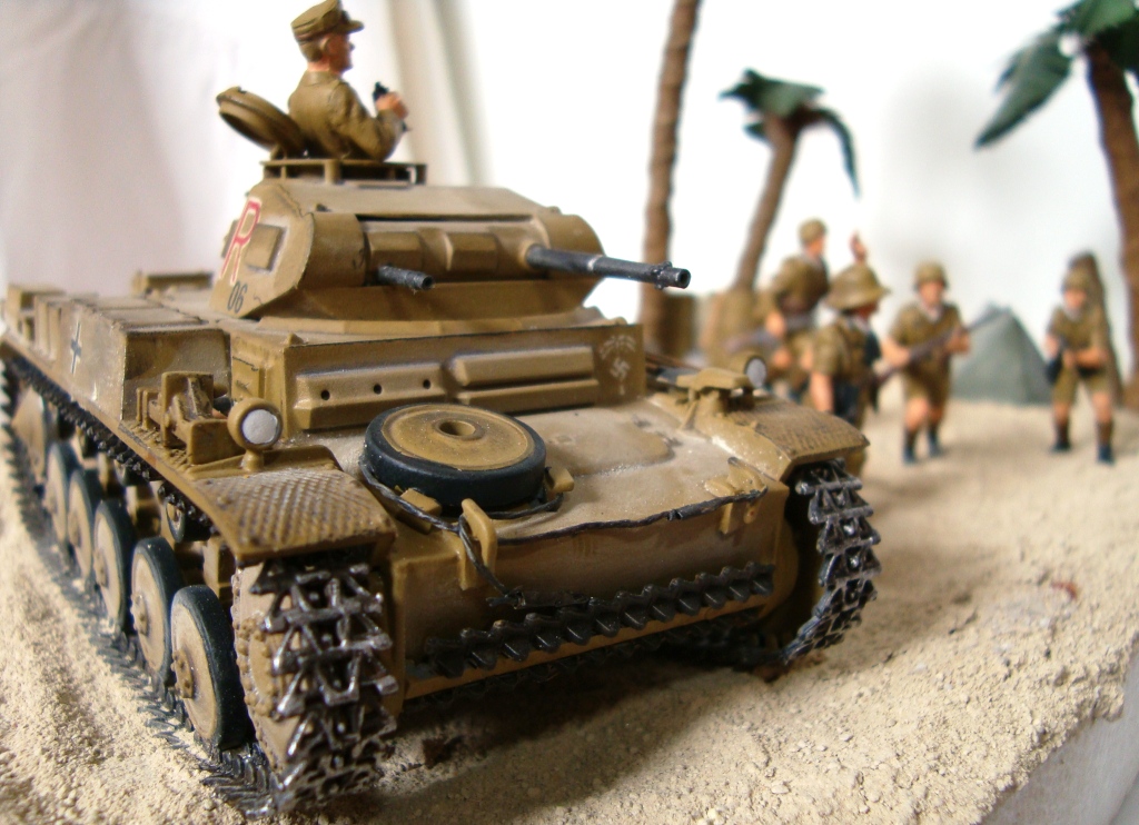 В диораме были использованы наборы от тамии с танком Т-II в комплекте шли солдаты, набор палаток и бочек с канистрами от тойже фирмы. Оснва диорамы пенопласт. Пальмы полностью самодельные технология изготовления описана в одноименной сказке. Песок использовался для шиншил. Покраска производилась кистями, красками от Тамии. Также были применены фильтры смывка и пигменты от фирмы Миг.