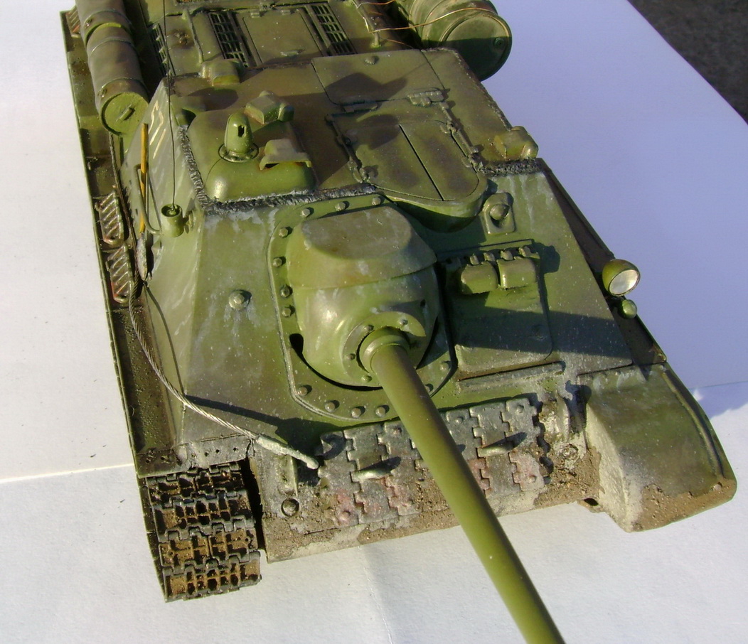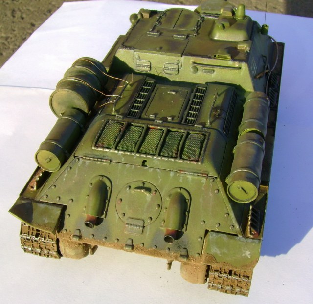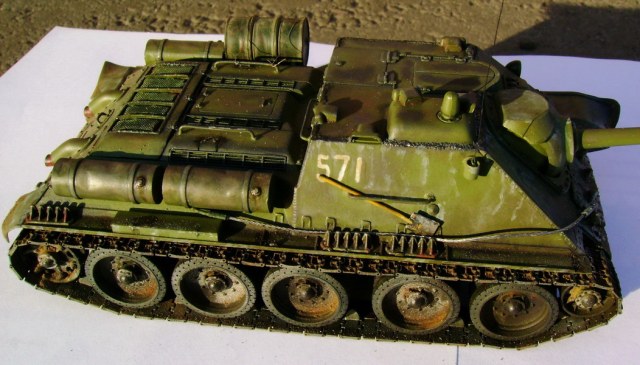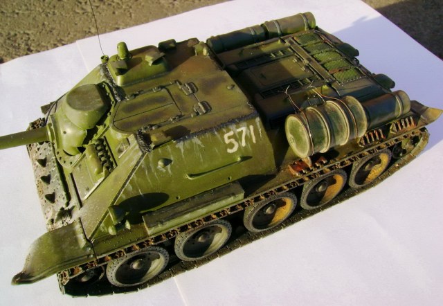 Самоходка, в целом, смотрится хорошо. Про щель сказали, а еще - ржавые выхлопные патрубки блестеть не должны. Видно, что ржавый цвет наносился уже после установки по месту. Но лучше их вставлять в самую последнюю очередь. И задуть копоть от выхлопа заранее.