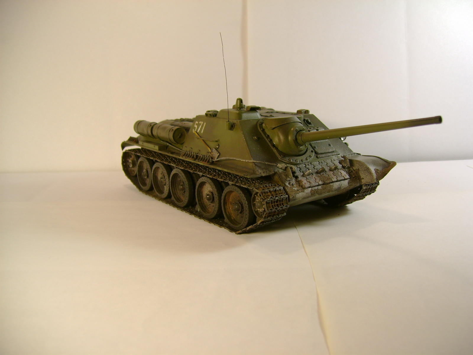 Здравствуйте Уважаемые. Представляю Вашему вниманию СУ-85 от TAMIYA. Из доработок вставлена металлическая сетка в крышку фрикционов, поручни металл, ствол Aber,гуси MasterClub,фара Elfбуксирный трос тоже металл. Базовая краска Акан БО-4, фильтры самомпал на базе масляной краски MIGсмывка тоже. Грязь гипс,аквариумные грунты ADA (перемолотые) окрашены пигментами АК двух видов. Бронекорпус ,пигменты TAMIYAи постель задувал лаком Акан матовый (глухой) и матовый аква. Приборы видения водителя сделаны из автомобильной быстрой стали некое подобие милипута стёкла на них MICROKRISTAL, бочка набор TAMIYA.