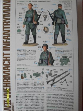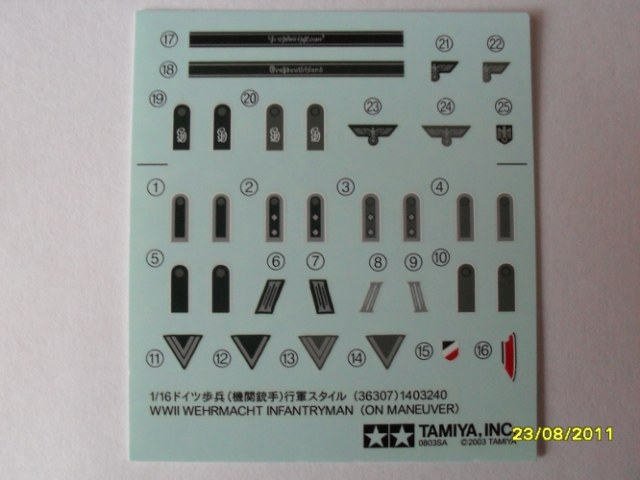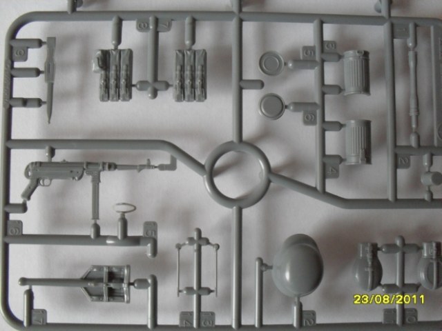 Набор интересный тем ,что кисти рук с манжетами рубашки вставляются в рукава мундира и не надо высверливать!Тоже и с воротником рубашки , воротником мундира все приклеивается по отдельности и не нужно выбирать лишнего.Лица дается два,и у каждого свое выражение. В наборе так же декали :погоны от рядового до оберфельдфебеля и с шифровками GD,орлы целые и половинчатые под ремень,нарукавные ленты GD,ленточка креста, ефрейторские шевроны.Еще дается мр-38 и пулемет мг-42,правда состоит из двух частей и половину снаряжения тоже,вот думаю шпаклевка наверное понадобится ,да и как сделать отверстия на каске вентиляции??Инструкции как таковой нет,только сзади на коробке дается небольшая нарисованная схема по сборке. В принципе набор не плохой,посмотрим как соберется