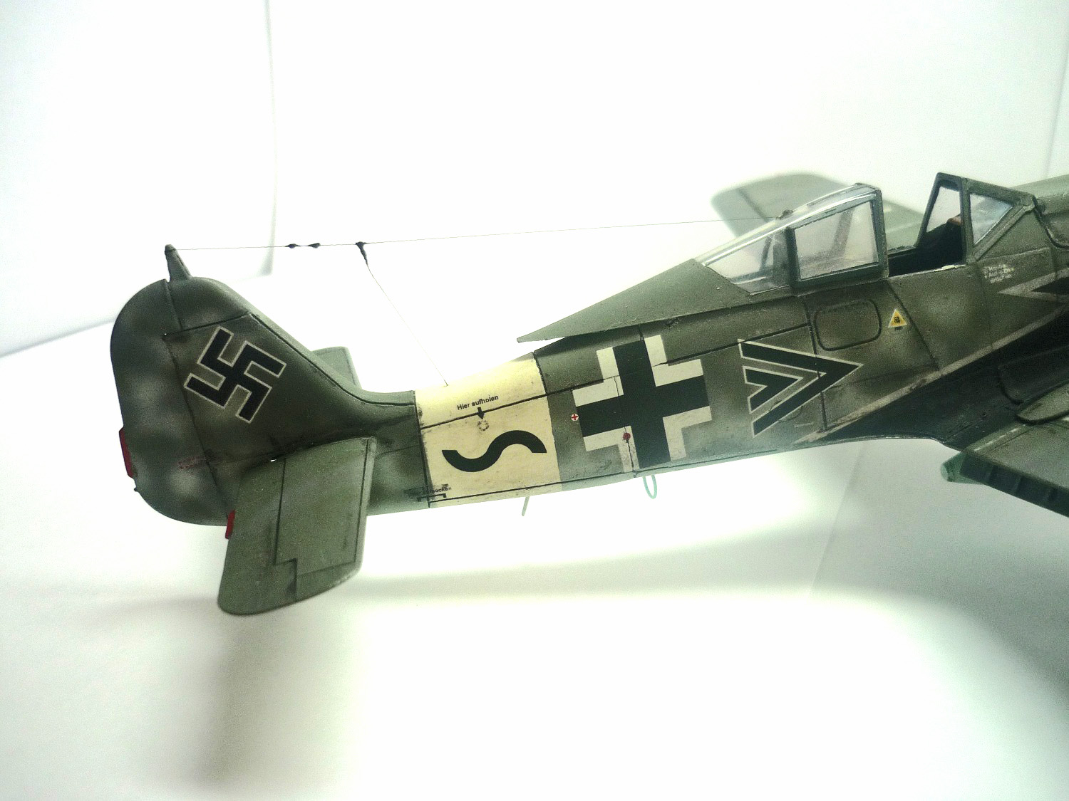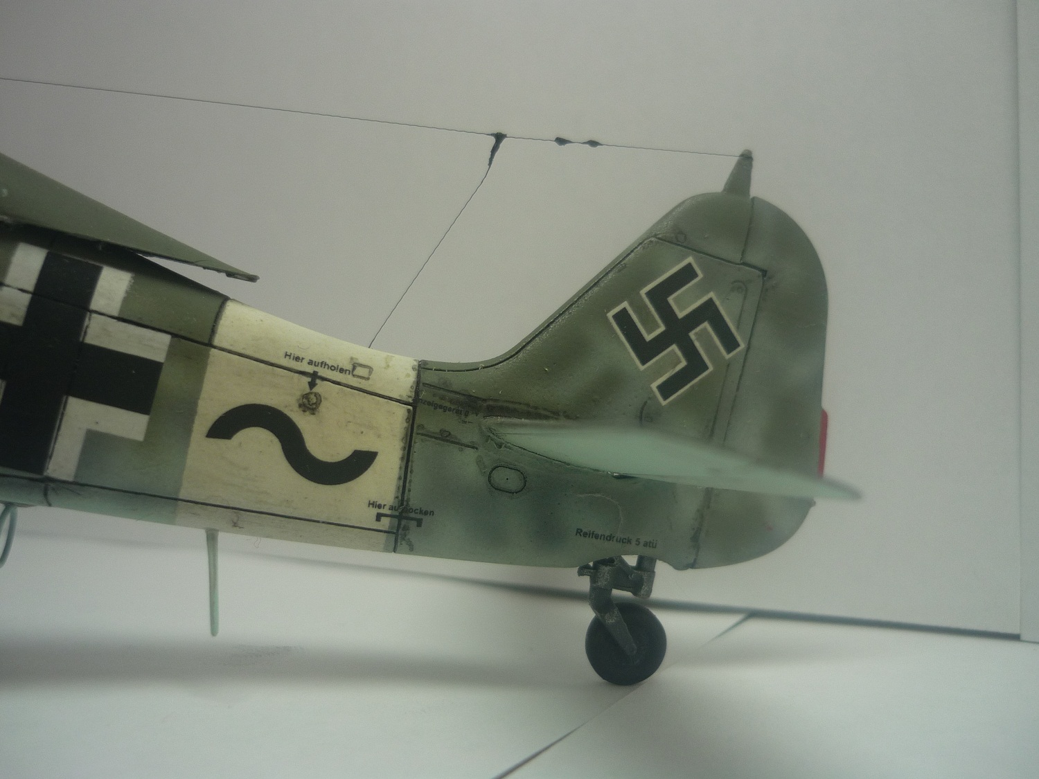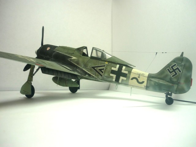 вот и закончил я ФОКУ!!! За прототип выбрал самолет изображенный на каробке,хотелось сделать фоккер Новотны,но не нашел декалей,и не стал заморачиваться(хотя желание осталось!как нибудь думаю построю).О модели много написано в нете! Собиралась без проблемм. Также использовал травление от того же эдика. красил звездой-супер.антенна-из бантика. пвд,пулеметы и пушки-иглы от шприцов разного диаметра. кольцевая антенна-проволока,антенна свой-чужой тож игла(вставил в нее тонкую проволоку,и немного сплюснул саму иглу). Добавил шланги на стойки(сделал колечки-хомутики.закрепил их на стойках,а в них протянул сами шланги).бано из тянутого прозрачного литника. использовал фольгу-самоклейку(зализы и броне листы на фюзеляже). углубил немного расшивку.закрылки вырезал,добавил на них силовые элементы, сделал их в отклоненном положении. при панесении декали на кок декаль рассыпалась.....возникла проблемма!!! как нарисовать спираль на коке.пытался делать маски из скоча,ничего не вышло....советовали от руки накрасить!!! и вдруг ЭВРИКА-задул кок белым,скатал из пластилина тонкую полоску,прилепил на кок по спирали,и задул черным!! результат вы видете!!!декалью так не получиться никогда!!! так же на фюзеляж с помощъю масок накрасил рисунок( это изображение орла, если бы капот не красить в черный,то на нем была бы как раз его голова).жалею что кресты не накрасил сам...декаль серебрится несмотря на все мои меры!!!! цвета мешал сам на глаз,в коробке был листок с образцами цветов...вроде все написал,жду критики от ВАС!