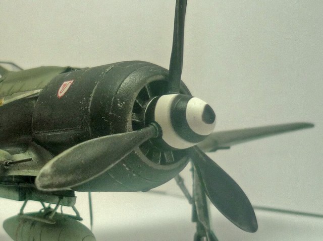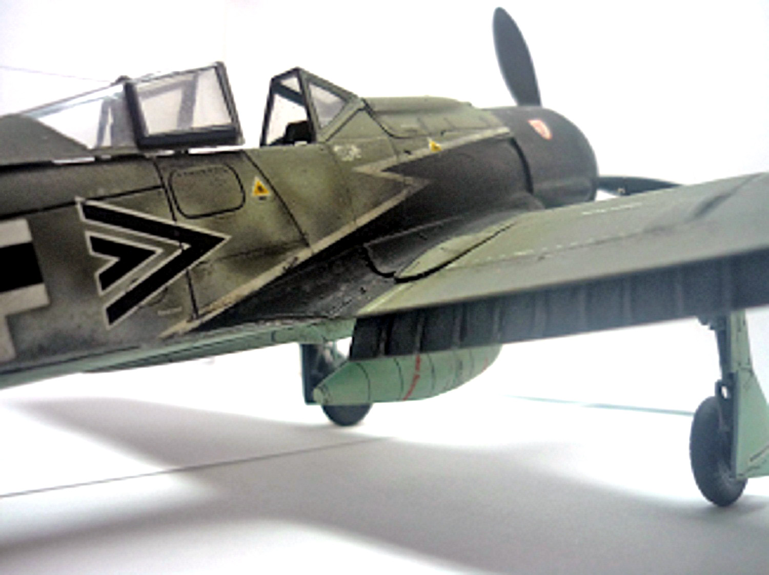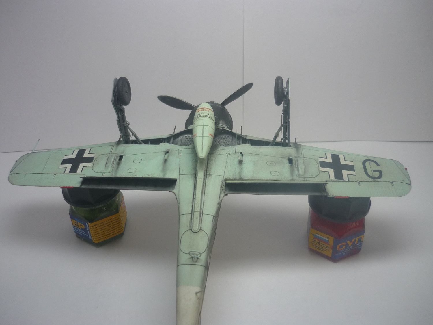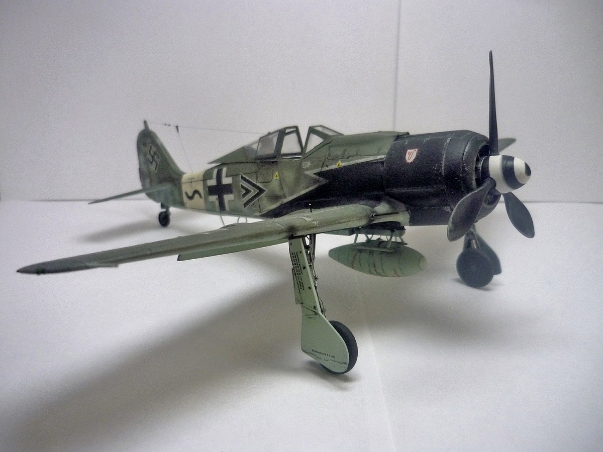 вот и закончил я ФОКУ!!! За прототип выбрал самолет изображенный на каробке,хотелось сделать фоккер Новотны,но не нашел декалей,и не стал заморачиваться(хотя желание осталось!как нибудь думаю построю).О модели много написано в нете! Собиралась без проблемм. Также использовал травление от того же эдика. красил звездой-супер.антенна-из бантика. пвд,пулеметы и пушки-иглы от шприцов разного диаметра. кольцевая антенна-проволока,антенна свой-чужой тож игла(вставил в нее тонкую проволоку,и немного сплюснул саму иглу). Добавил шланги на стойки(сделал колечки-хомутики.закрепил их на стойках,а в них протянул сами шланги).бано из тянутого прозрачного литника. использовал фольгу-самоклейку(зализы и броне листы на фюзеляже). углубил немного расшивку.закрылки вырезал,добавил на них силовые элементы, сделал их в отклоненном положении. при панесении декали на кок декаль рассыпалась.....возникла проблемма!!! как нарисовать спираль на коке.пытался делать маски из скоча,ничего не вышло....советовали от руки накрасить!!! и вдруг ЭВРИКА-задул кок белым,скатал из пластилина тонкую полоску,прилепил на кок по спирали,и задул черным!! результат вы видете!!!декалью так не получиться никогда!!! так же на фюзеляж с помощъю масок накрасил рисунок( это изображение орла, если бы капот не красить в черный,то на нем была бы как раз его голова).жалею что кресты не накрасил сам...декаль серебрится несмотря на все мои меры!!!! цвета мешал сам на глаз,в коробке был листок с образцами цветов...вроде все написал,жду критики от ВАС!