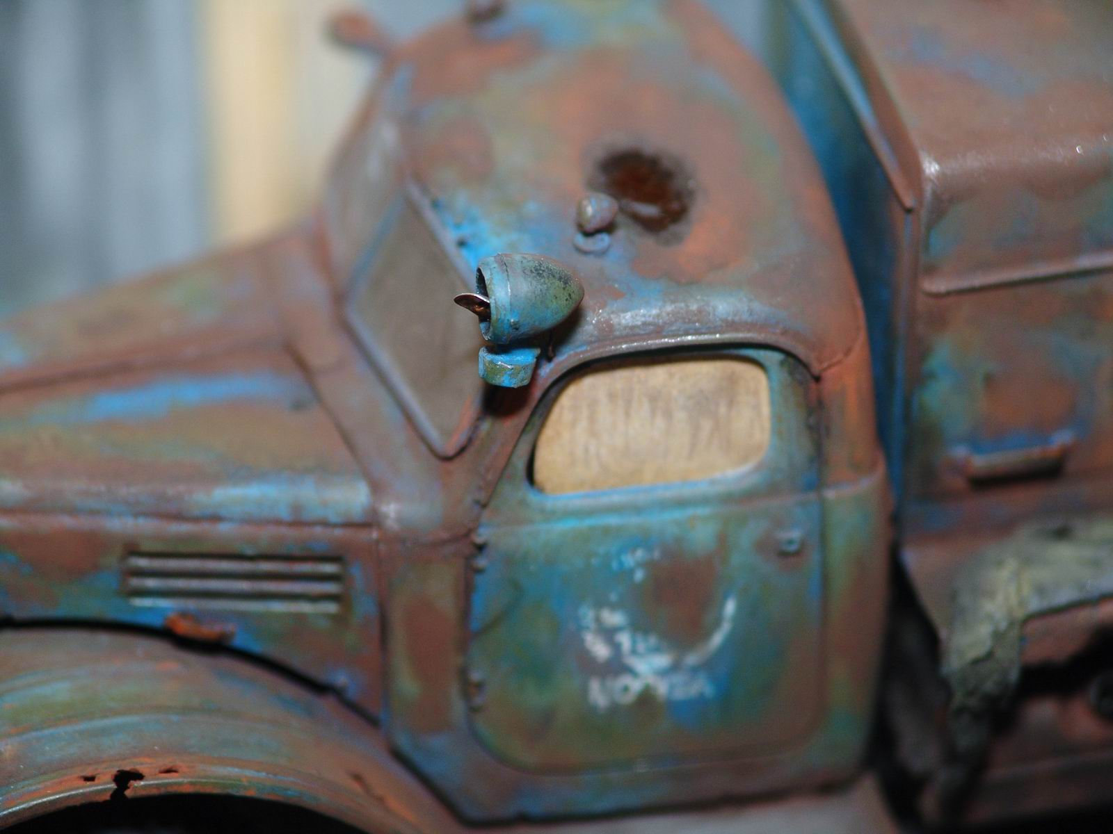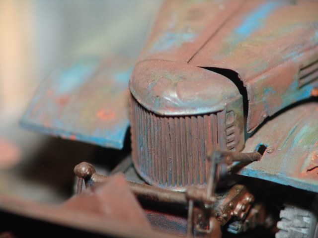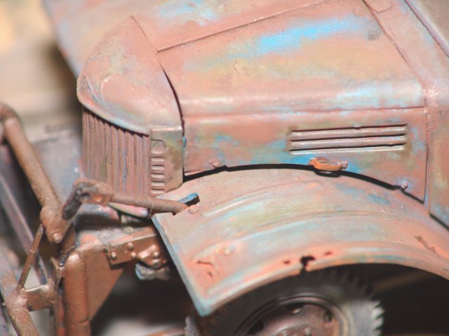 По поводу ржавчины, я уже писал выше, не знаю почему (не химик) но на старо-ржавых машинах ржа лежит практически равномерным цветом, видимо на поверхности образуется что то типа патины. Есть небольшие вкрапления более светлых тонов, но на модели они тоже есть.