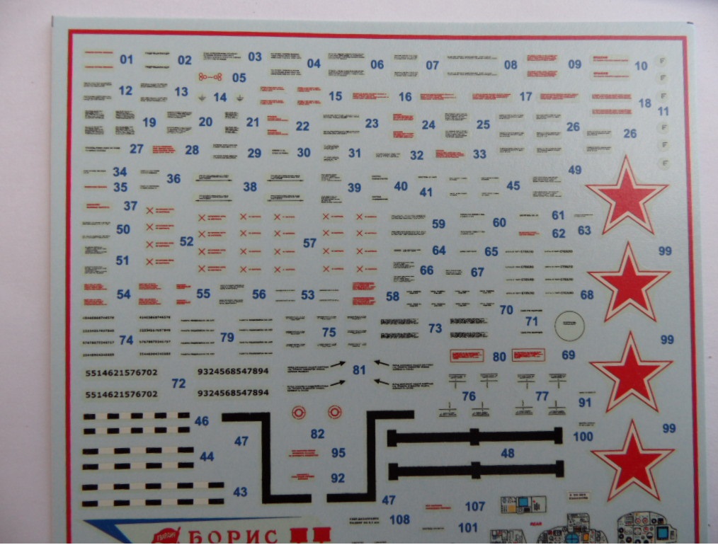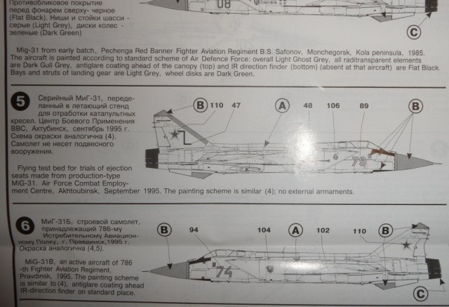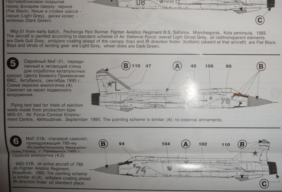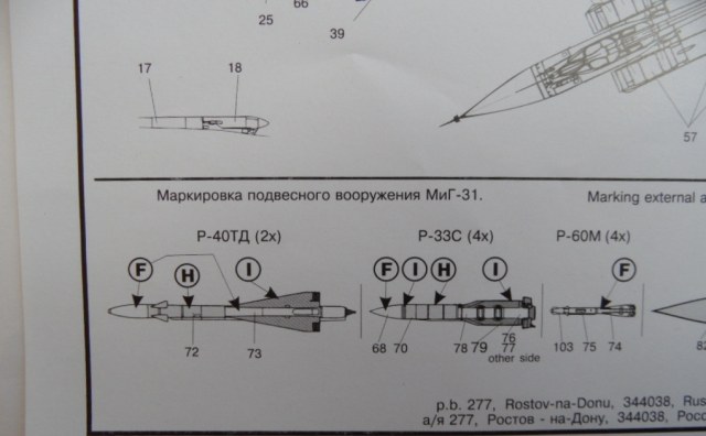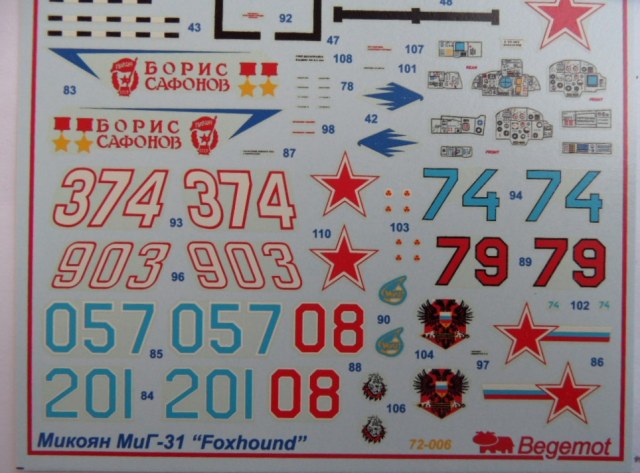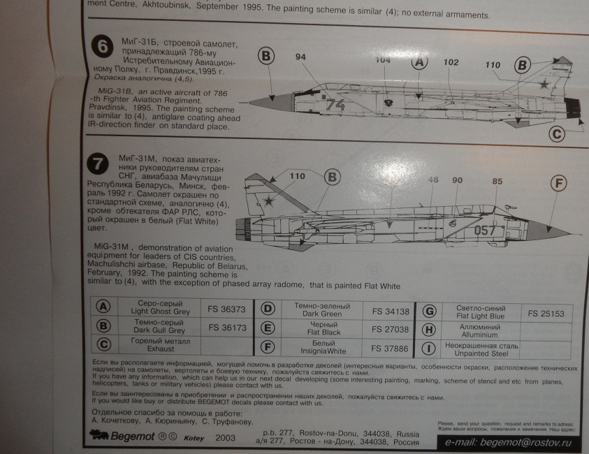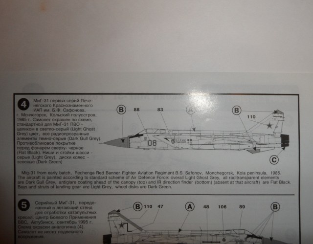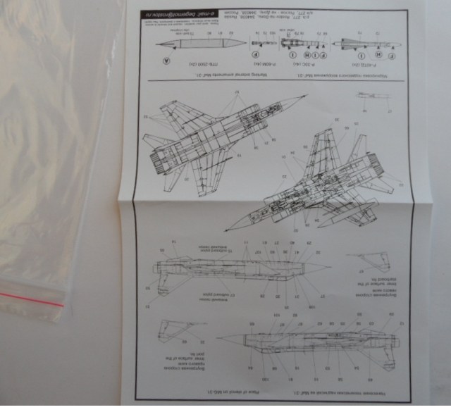 Всем привет , решил сделать небольшой обзор на декаль от фирмы Бегемот на Миг 31.Декаль на 7 вариантов маркировки МиГ-31: МиГ-31, МиГ-31Б, МиГ-31Э, МиГ-31М. Полный набор технических надписей на самолет и различное подвесное вооружение. В комплект входит один лист декали стандартного размера и инструкция на 3-х листах формата А4. Данная декаль интересна тем что там дана и техничка, причем как на самолет так и на вооружение- отдельно приобретать не потребуется. Декалью так же даются приборы. Сами рисунки отличного качества, но вот подлжка желтеет маленько- нужно будет что то думать.