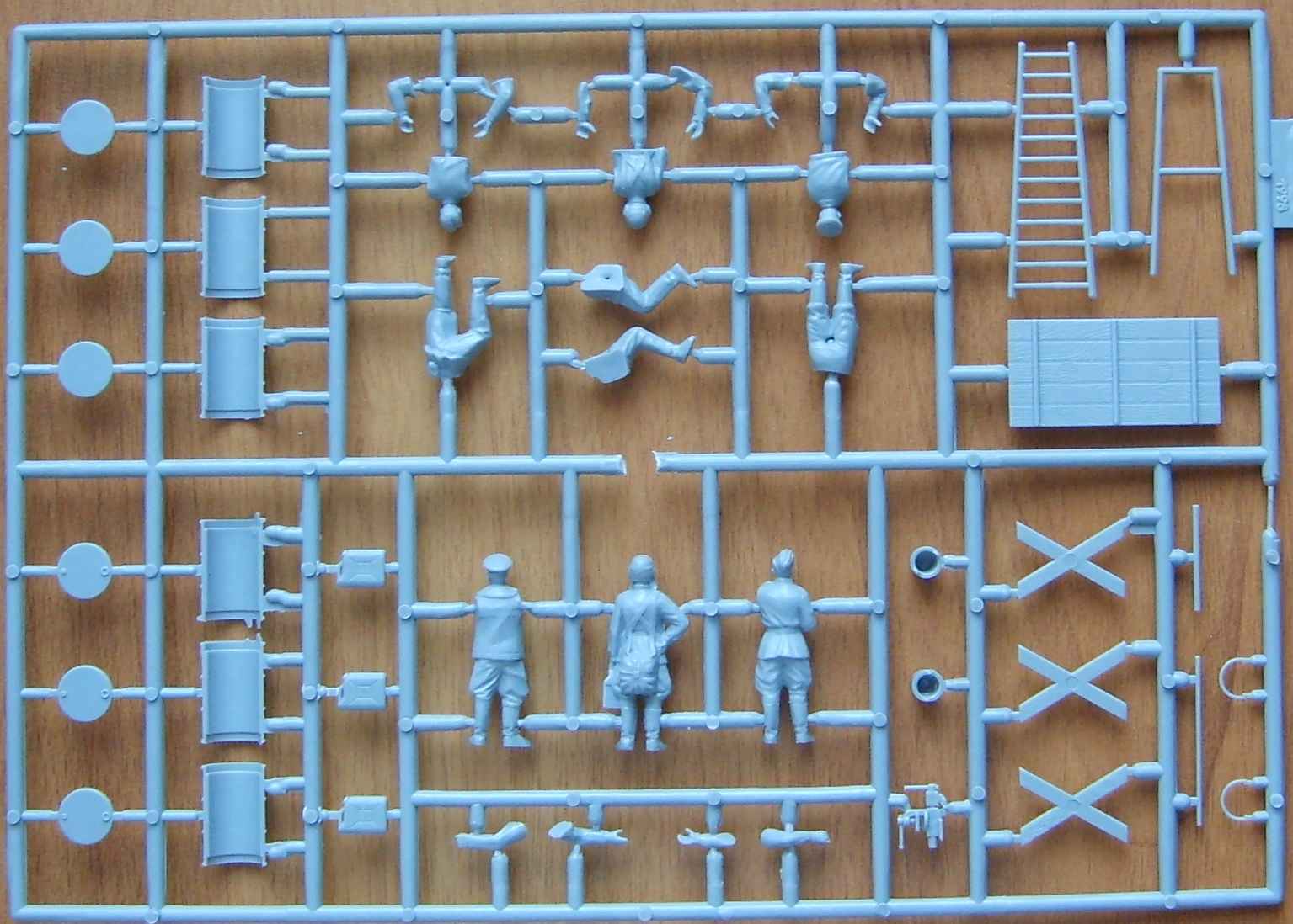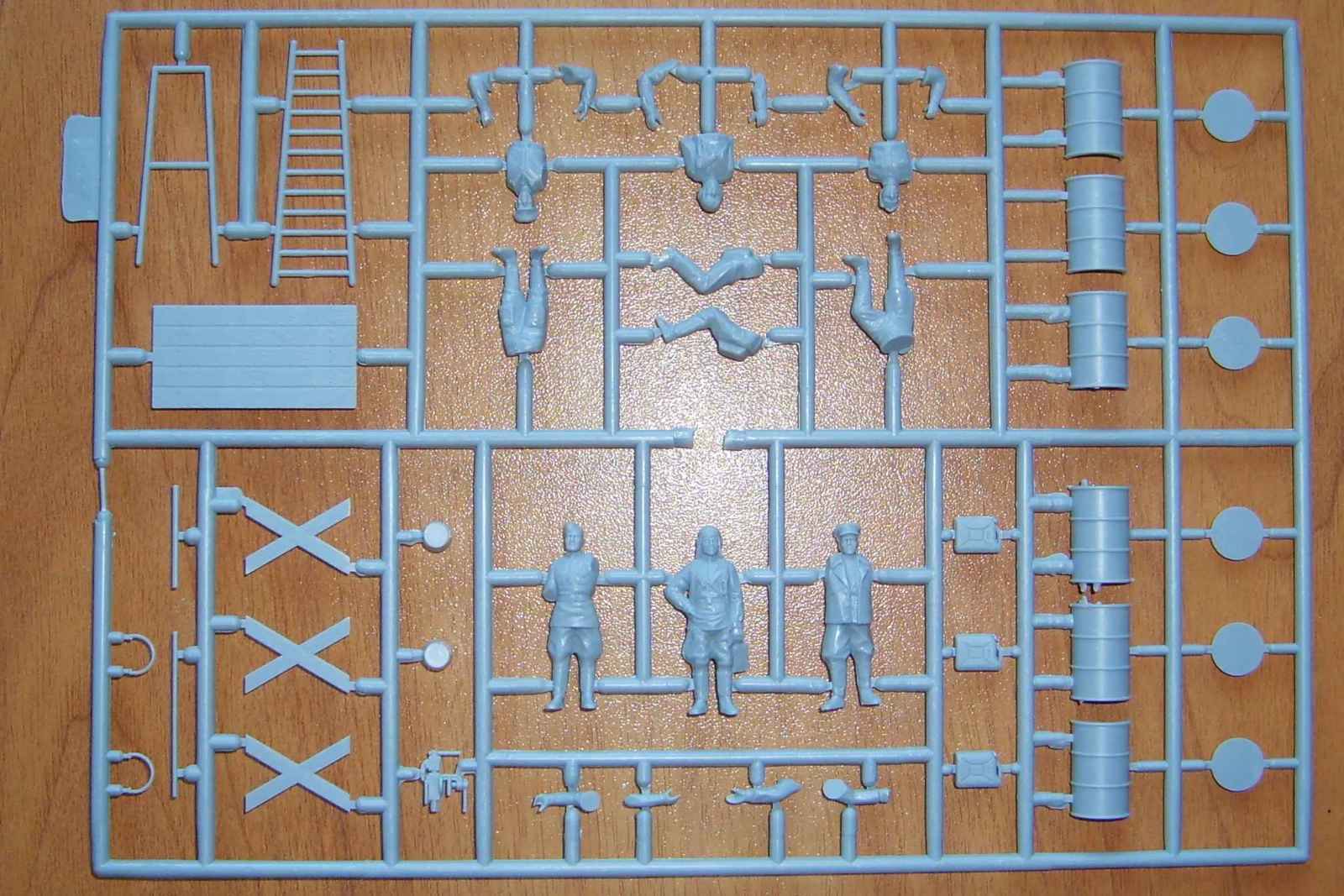 На литнике находятся шесть фигурок, стол, тиски,несколько бочек и канистр, а так же два ведра.