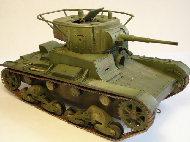 Хорошо получился Т-26, тонировка очень неплоха. Конечно, до примерной копийности надо бы кучу клепок и болтов поставить, и много всего другого, но и так танк выглядит здорово. Не понравилось: отсутствие фото вида сзади. И, кстати, где ручка на люке на лобовом листе и надо было бы рассверлить хомуты на тележках ходовой.
