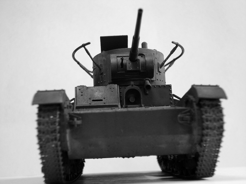 Вполне смотрибельно и образ Т-26 передан - но только образ. Раз уж поставили катки и ленивец от Комплекта ЗИП, что ж помешало вклеить в бронировку фару от Эльфа(бронировку кстати надо сильно обточить до масштабной толщины), добавить штук 80 заклёпок - на петлях всех люков на крыше башни и на башне на цилиндрической части под нишей , маску пушки сделать либо штампованную, либо сварную - у Вас нечто среднее между ними. И под стволом на маске приладить ручку.Да не помешали бы домкрат, запасная рессора и брезент. И косынки на крыльях сильно толстые. Не придираюсь, просто советы по доработке.
