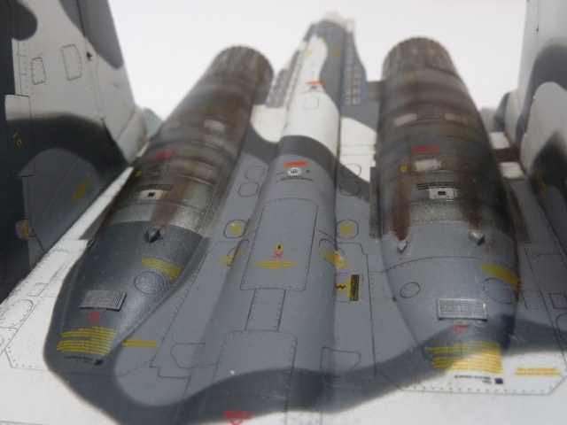 Вот честно - попугайский вариант, да еще и с муляжами. В полете сия машина с ракетами вроде не светилась. А по сему - интереснее будет перед самолетом поставить ракеты либо на тележках, либо на стапелях. И, к стати, так будет лучше даже с точки зрения композиции...ИМХО...
