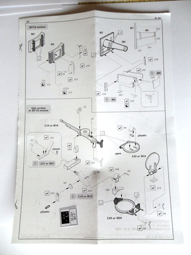 Прежде всего хочу представить набор фототравления фирмы "Эдуард" для БТ- 7 от ВЭ (№ 35421). Ранее я не сталкивался именно с этим набором и думал, что там одна плата (как на рисунках в магазинах). Но я был приятно удивлен: в наборе 4 платы фототравления, подробная инструкция. Набор сделан в присущей чехам манере: хороший металл, высокое качество, обилие различных деталей. Набор позиционируется как специальный для серии танков БТ-7 от ВЭ. В наборе есть варианты травления для танков 1935 г. (с цилиндрической башней), 1937 г. (с конической башней), БТ-7А (с 76-мм пушкой), и для танков с радиостанцией. Так что у меня еще и останется травло на другие варианты БТ-7 (если вздумаю собирать другие варианты). Стоимость набора 450 рублей.
