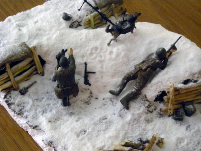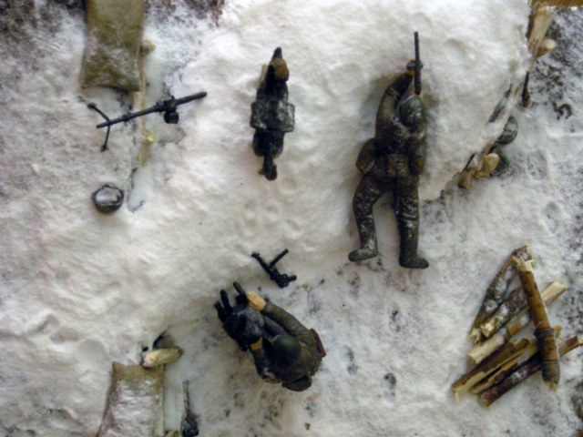 В диораму (может на месте тех же веток- самое место)- сделать воронку от взрыва- как диссонанс всему белому. Это бы усилило восприятие от увиденной диорамы.