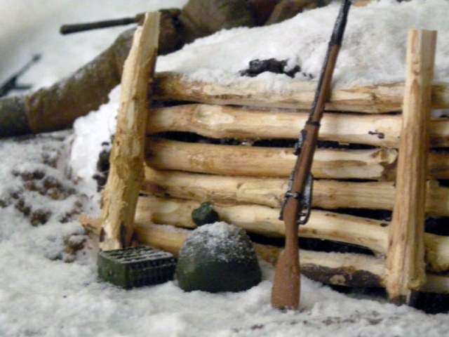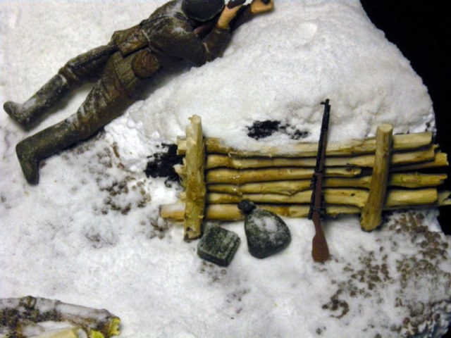 Окоп обкладывал обломаными и очищенными ветками, приклеивал полиуретановым клеем. Мешки лепил из эпоксилина. Пулемёт остался из набора "БМВ Р-12" от Звезды. Сошки от mg 34 изначально были сложены, я их распилил и расставил. Солдатики и пёсики от "звезды". Снег - сода, местами + ПВА.