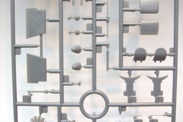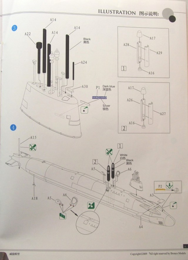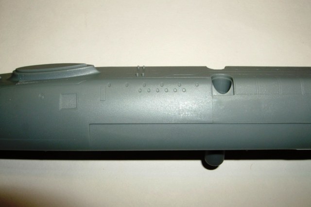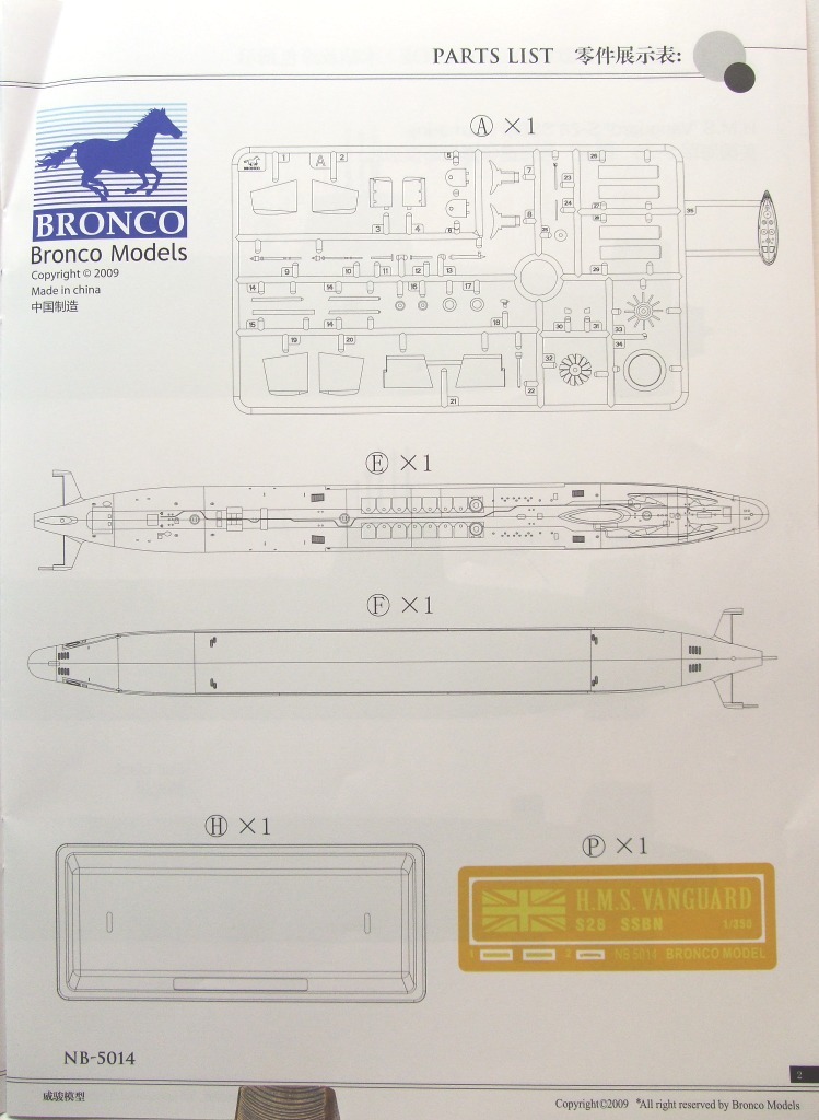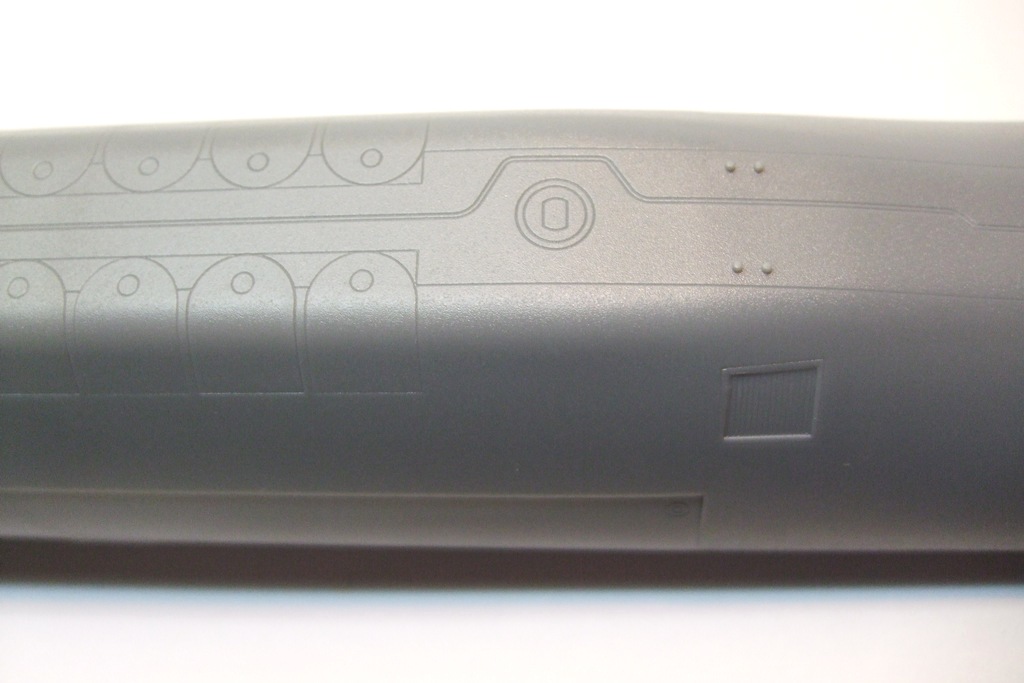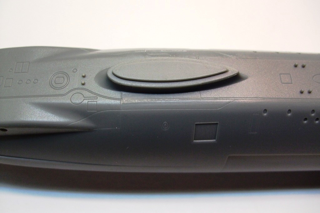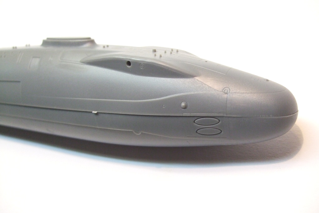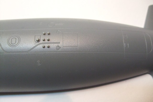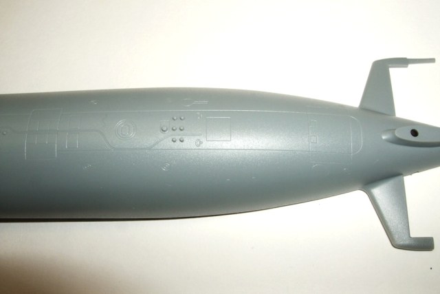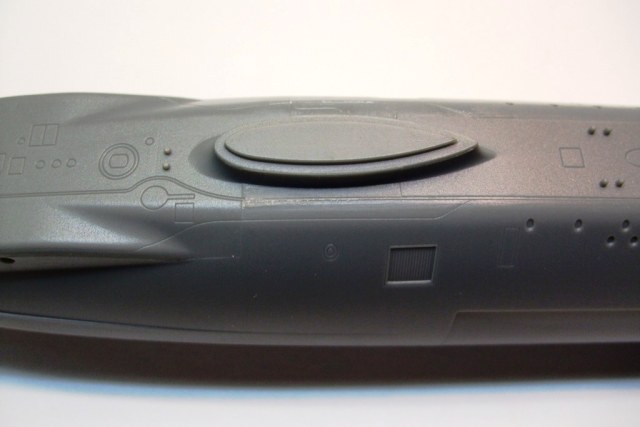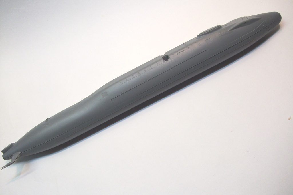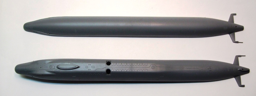 Корпус состоит из двух половинок отлит по схеме "верх-низ". Рубка дана одной деталью на единственной рамке вместе с другими мелкими деталями. Набор дает возможность сделать две передние шахты БР открытими, Хорошо что ракеты состоят из четырех деталей (2 половинки корпуса, головной обтекатель и сопло двигателя) благодаря этому утяжин на них нет. Так же есть ракетные шахты, похожие на пробирки, отлитые зацело с верхней половиной корпуса.