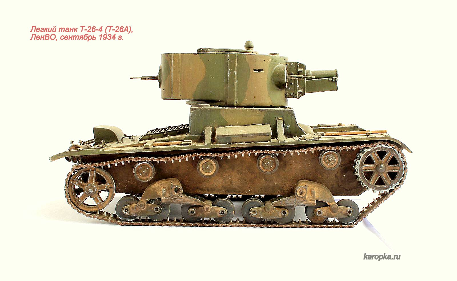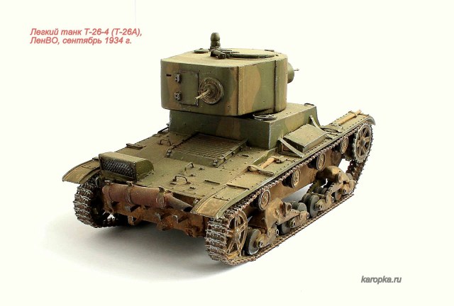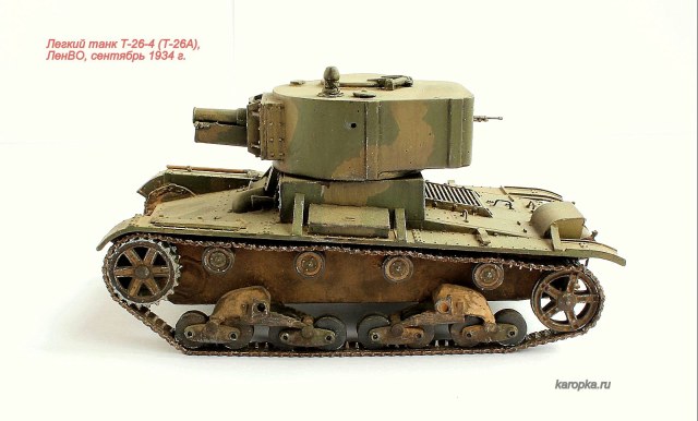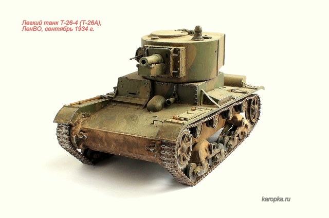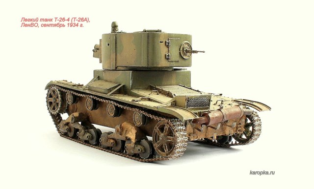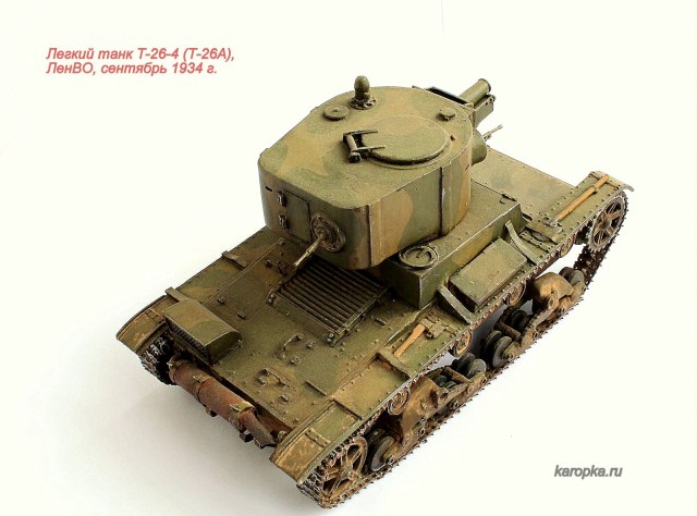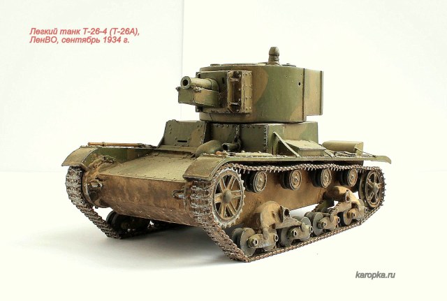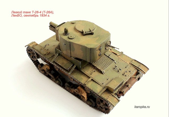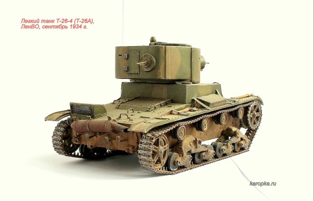 Приветствую коллег по хобби! Представляю очередную модель - "макетовское" видение лекого танка Т-26-4. Непосредственно от "Макета" в наборе только коробка и инструкция (и та с неправильными историческими данными). Корпус и гусеницы "звездовские" (даже с логотипом), а башня смоляная от "Комбрига". По внешнему виду башня больше напоминает башню от Т-29, а не Т-26-4 или БТ-7А. Хотя, по-моему, народ до сих пор спорит, какая башня стояла на Т-26-4. По одной информации, эта башня перекочевала на Т-29, по другой - на БТ-7А, но в том то и дело, что по внешнему виду эти башни различаются. Так что, не имея точной информации, я и назвал модель: "что-то, похожее на Т-26-4".