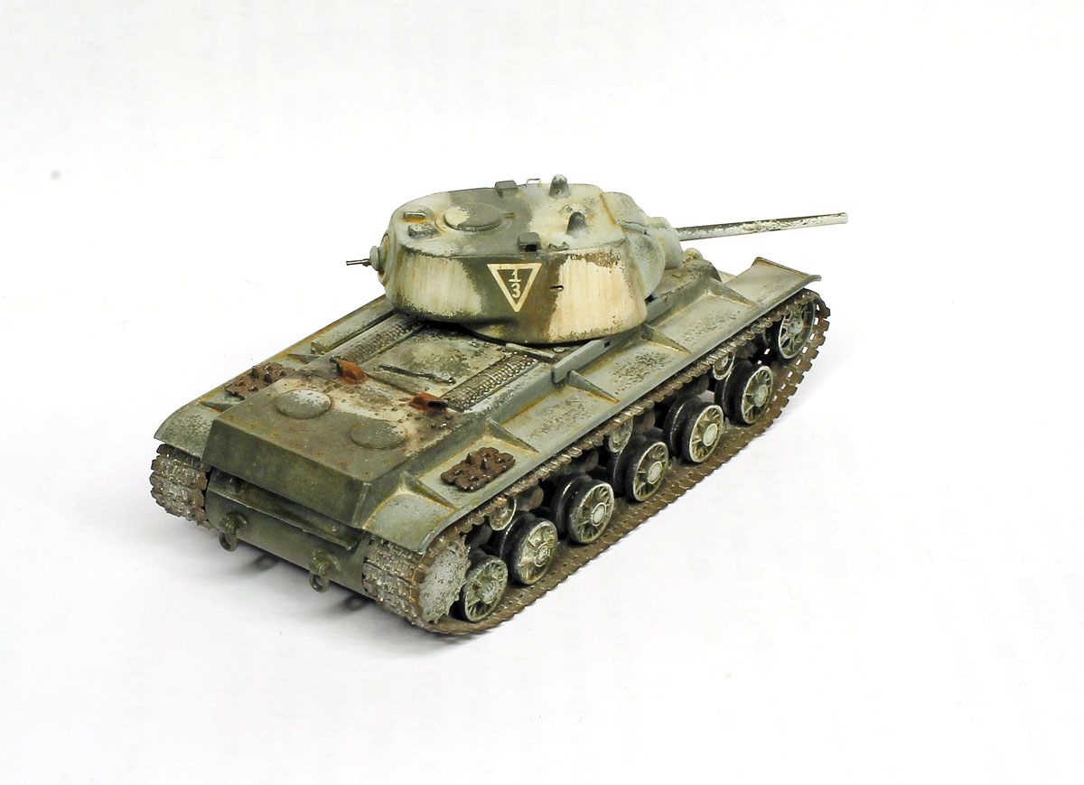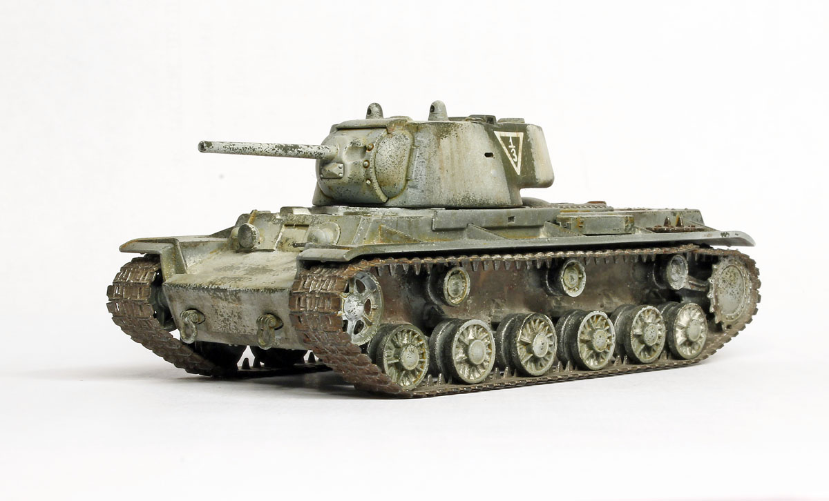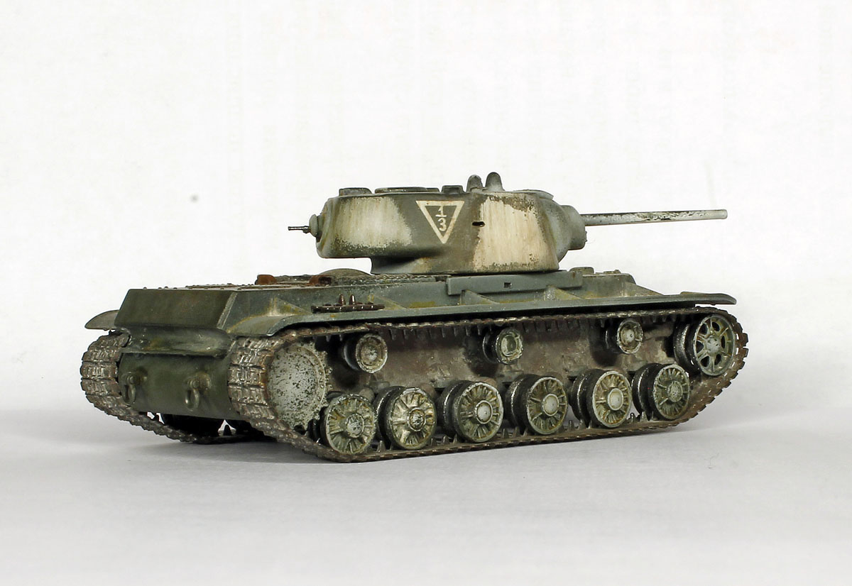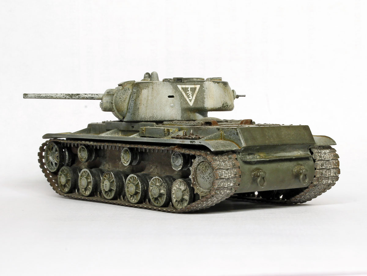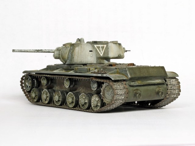 КВ-1, не очень нравится эта машина, поэтому в матчасть особо не вдавался. к тому же сам набор от трубача энтузиазма не вызвал. собрано практически без доработок, добавлены только поручни на башне, вставлены смотровые приборы из прозрачных литников, рассверлены выхлопные патрубки.