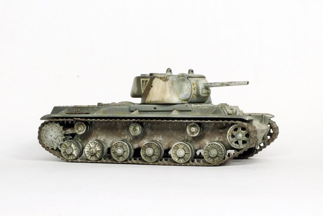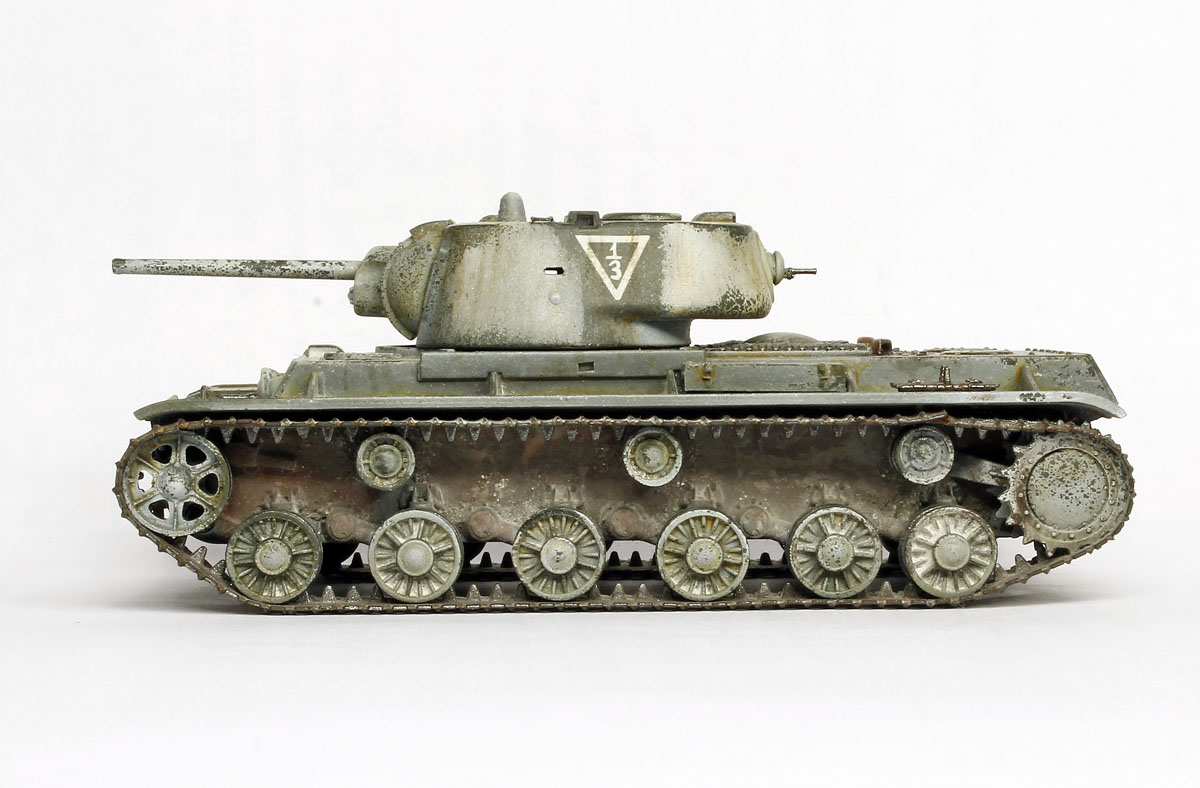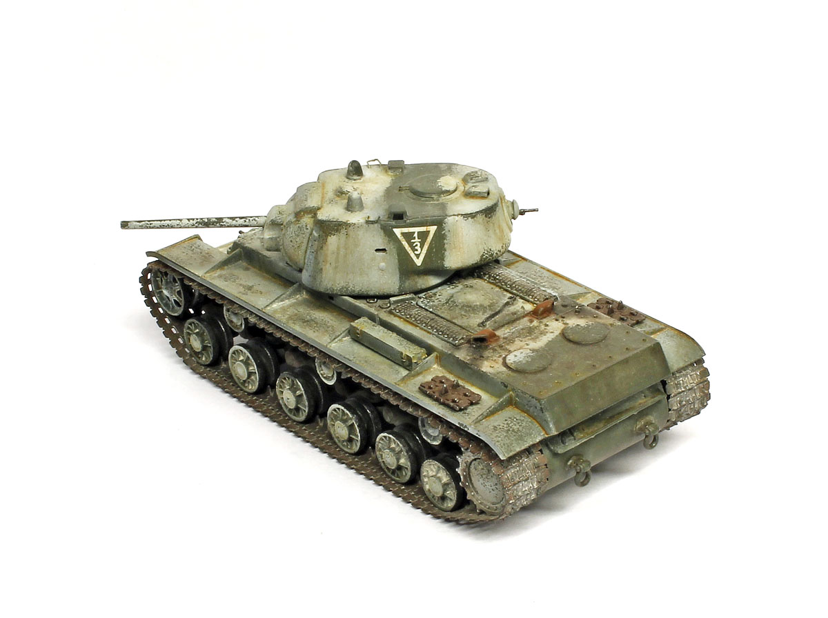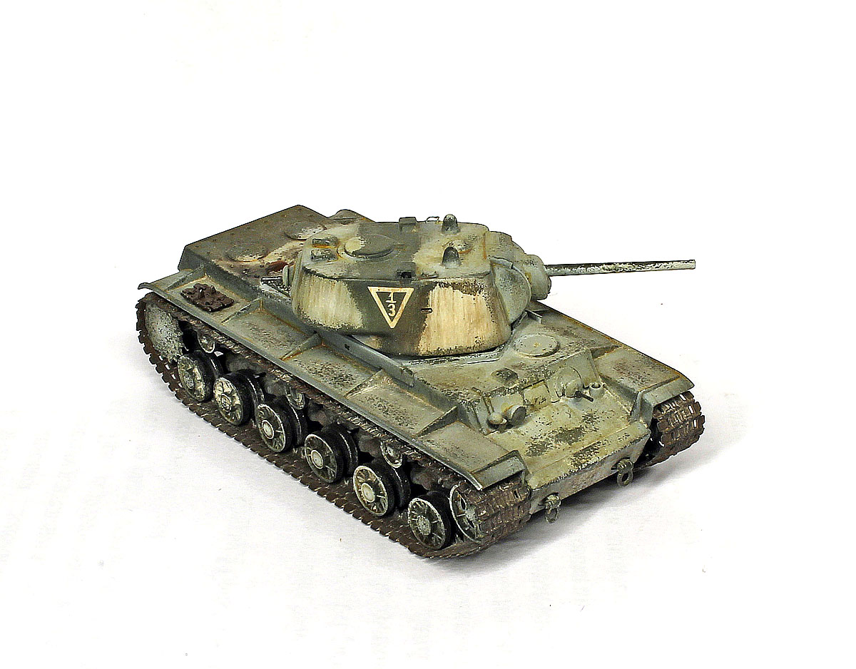 КВ-1, не очень нравится эта машина, поэтому в матчасть особо не вдавался. к тому же сам набор от трубача энтузиазма не вызвал. собрано практически без доработок, добавлены только поручни на башне, вставлены смотровые приборы из прозрачных литников, рассверлены выхлопные патрубки.