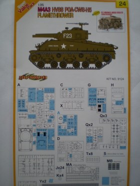 Хочу представить очередную находку на просторах e-bayэто модельМ4А3 FLAMETHROWER от фирмы«Dragon» в перепаке от cyber-hobby. Открыв коробку, был удивлён, в наборе имеется металлический трос, хорошая платка с травление литник прозрачного пластика с триплексами металлические элементы ходовой и пружины думается ходовая, будет полностью рабочей. Очень удивили катки, они даны без бандажей, а сами бандажи лежат отдельно в пакете. Ванна корпуса дана отдельно, сам корпус очень порадовал качеством, даже есть горловины топливных баков, на башне очень понравилась имитация брони на литниках с элементами танка много лишних деталей, в том числе и от танка першинг. Траки даны только виниловые, но на них придётся приклеивать пластиковые гребни, декаль идёт на три варианта 45 и 51 года. Ещё в коробке имеется бонус в виде набора пехоты, которая выполнена тоже очень качественно.