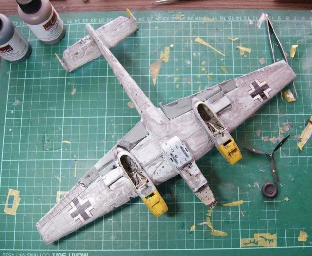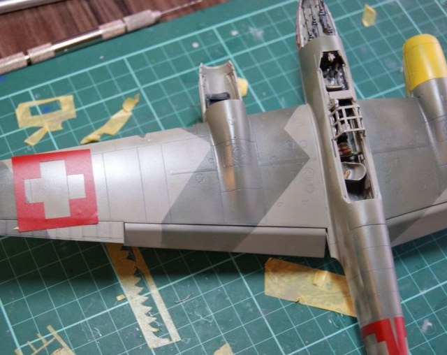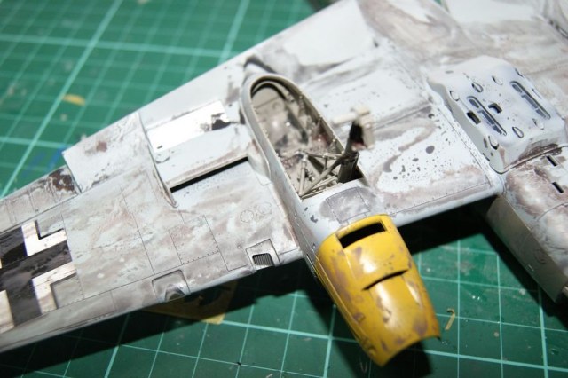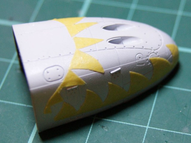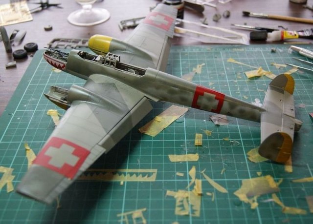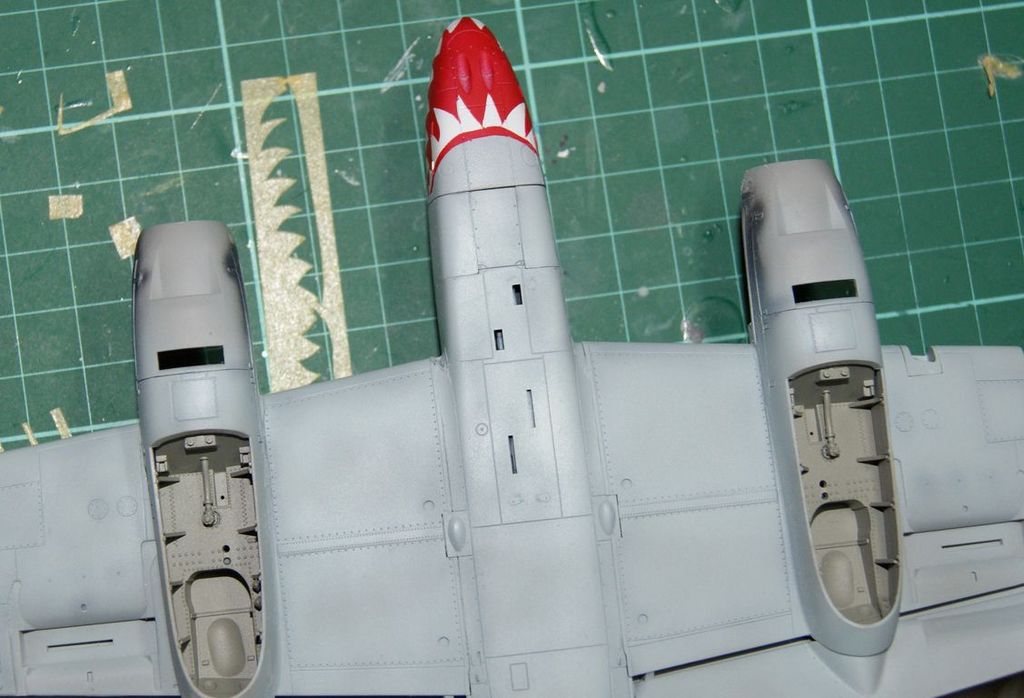 Выхлопные патрубки были расточены с помощью бормашинки. Боковые части фонаря (те которые опущены вниз) взяты из набора Eduard, стекла изготовлены из пленки для фотовывода, добавлены ручки на подвижные форточки. Стенки капота левого мотора были сточены до масштабной толщины. Красилась модель по родной инструкции от Dragon красками Testors на родном растворителе. После просушки задута футурой, затем красилась пасть и наносились ОЗ.