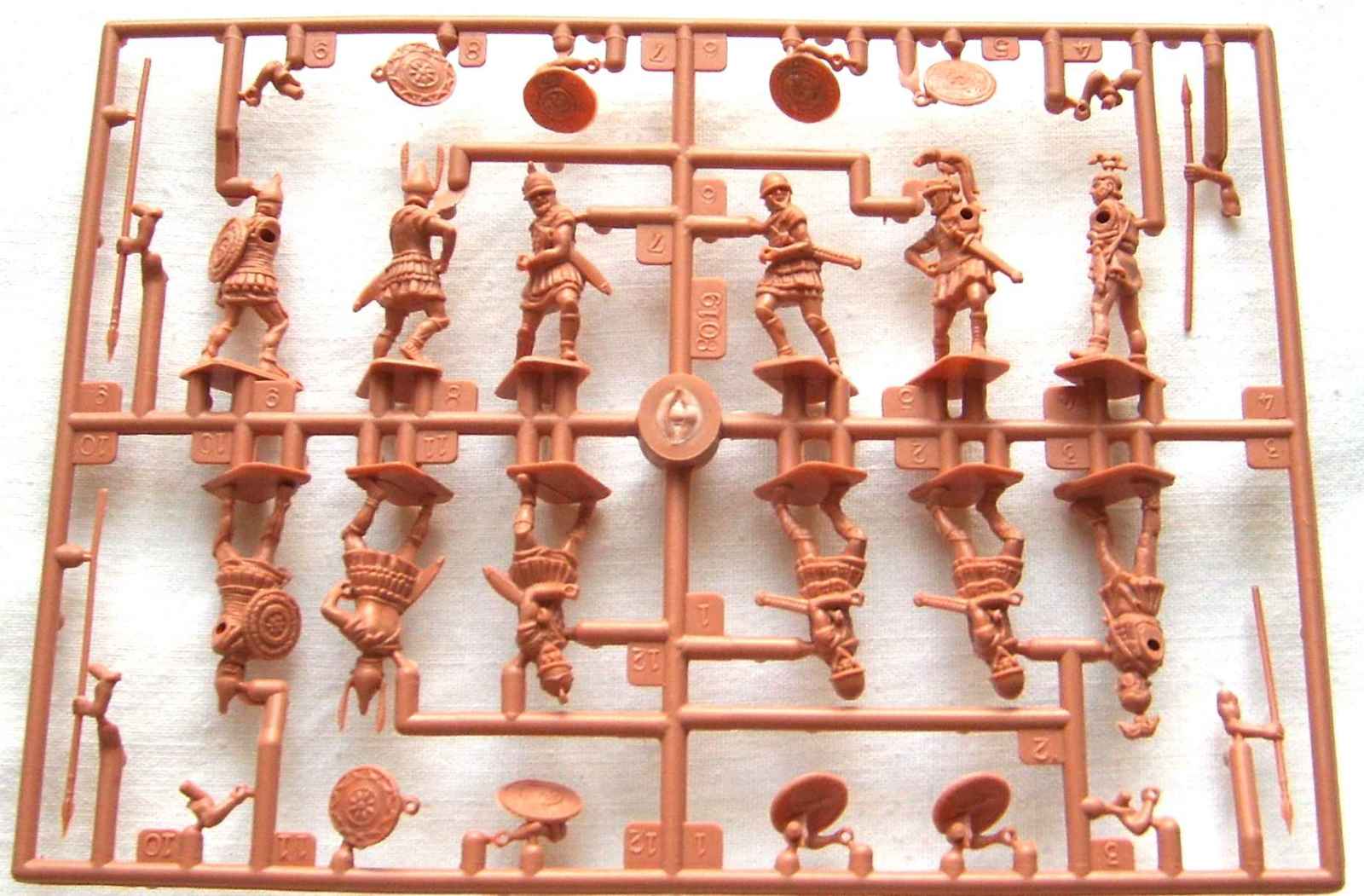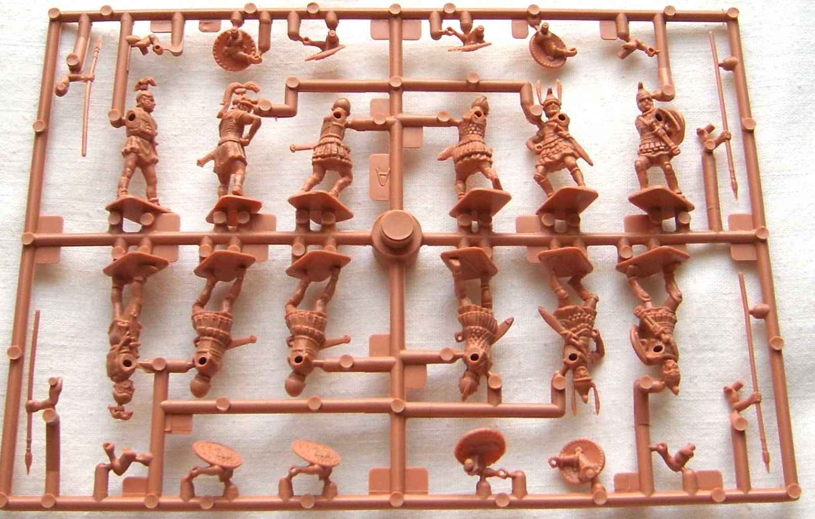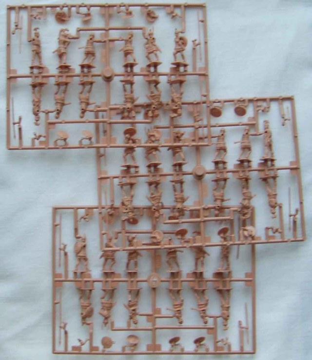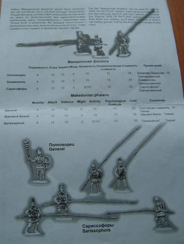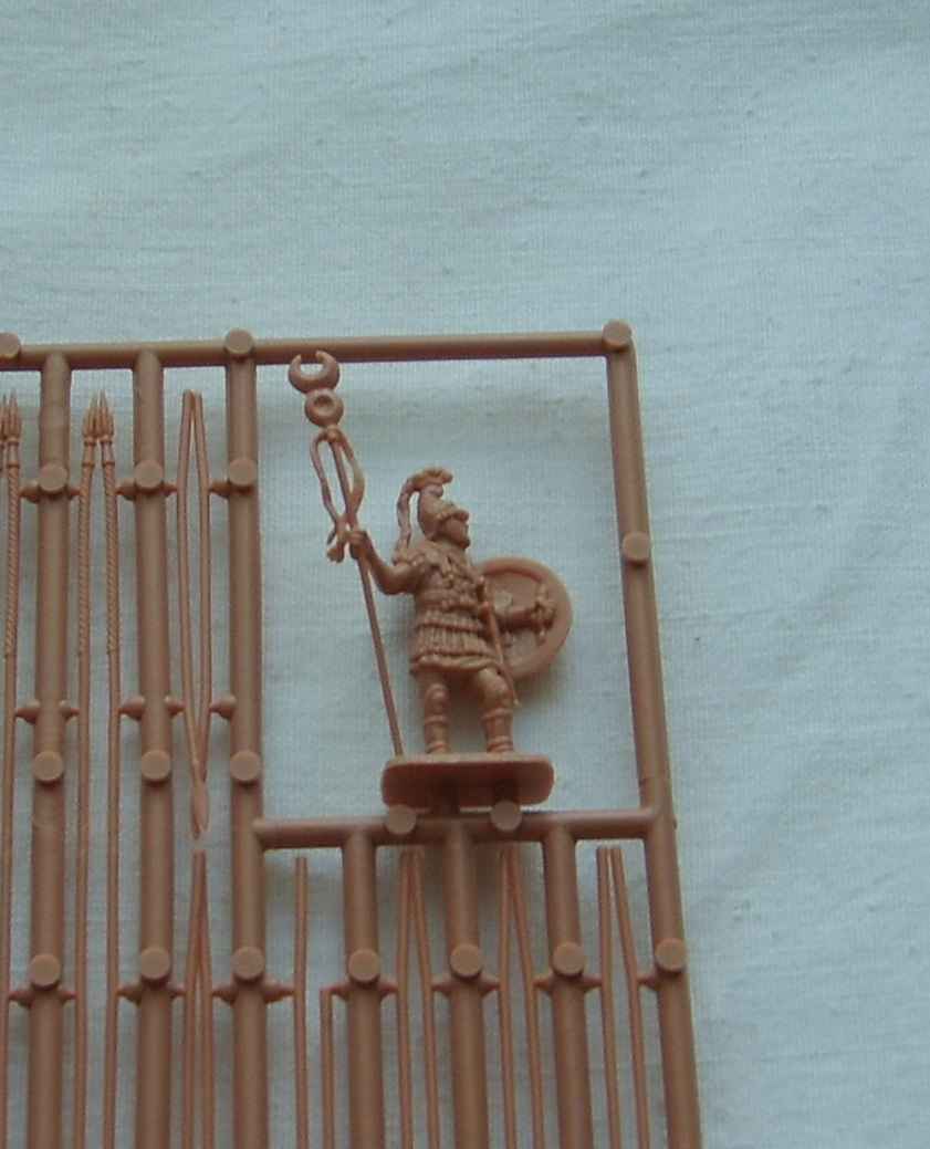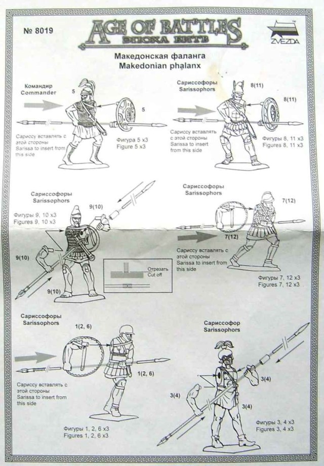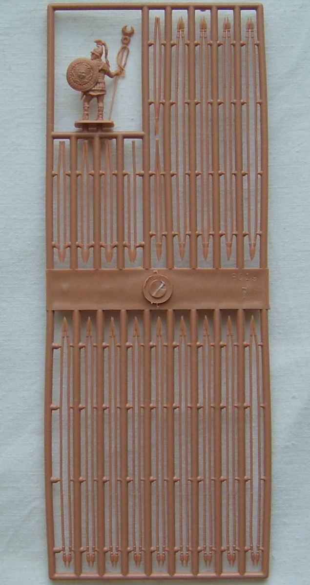Фигурки распологаются на 4-х литниках, три из которых повторяются. На единственном отличающемся литнике расположен знаменосец и сами сариссы. В коробку вложена инструкция по сборке (она же карточка с игровыми характеристиками), распечатанная на листе А4. Пластик бежевого цвета, легко поддаются обработке.