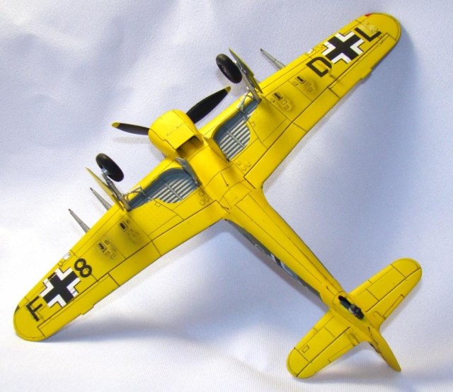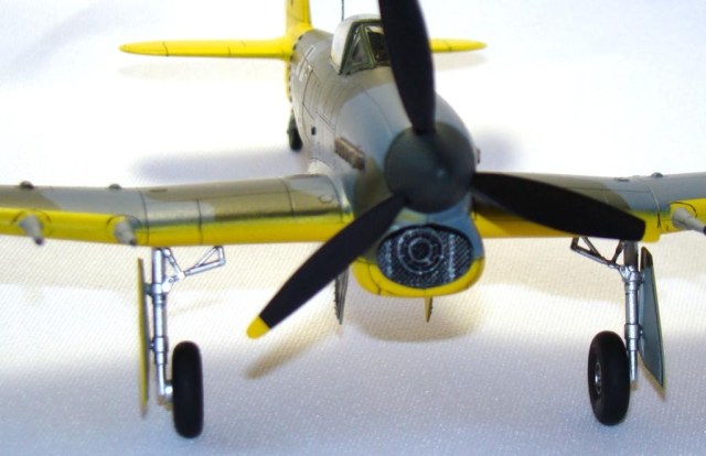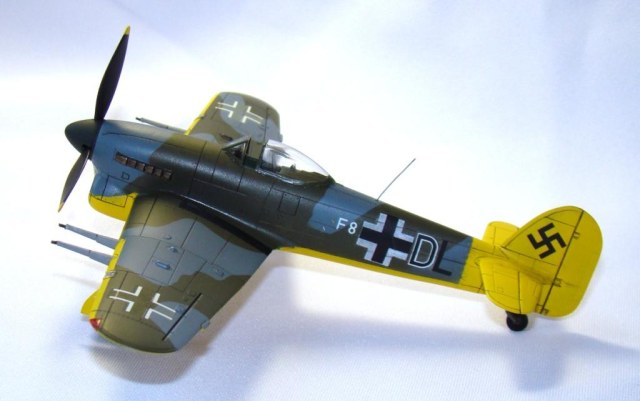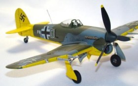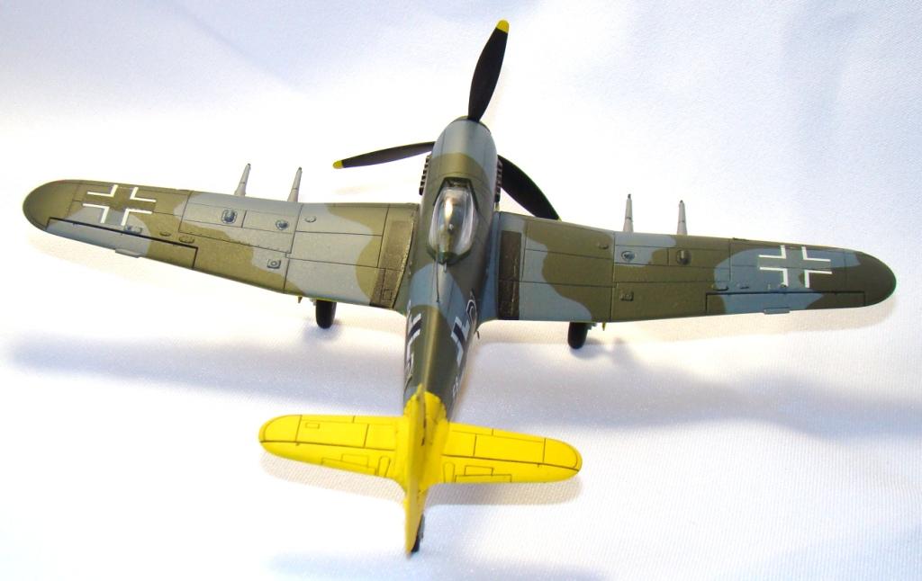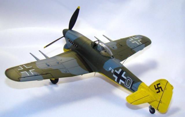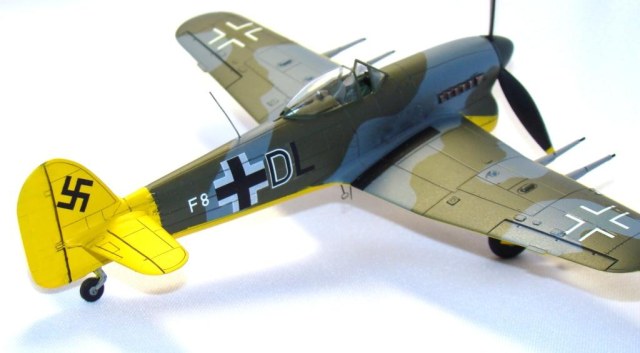 В связи с появлением на каропке большого количества Тайфунов решил внести свой скромный вклад. Набор от академии купил давно, но делать с ним ничего не хотелось, даже после покупки набора травления от эдуарда собирать и красить очередного скучного британца не было никакого желания. Потом, ищя что-то, наткнулся на "палитре крыла" на схему окраски немцами трофейных английских самолётов, в том числе и тайфуна, правда, ранней модификации. Решил сделать что-то из серии What if..., поскольку не знаю, доставался ли немцам тайфун этой модификации. Окраска аэрографом тамией, от себя антенна и стволы из игл.