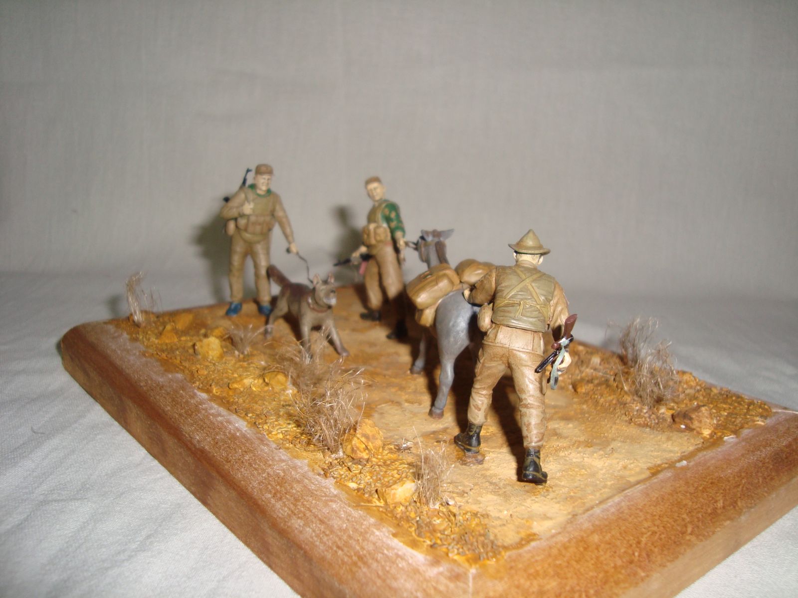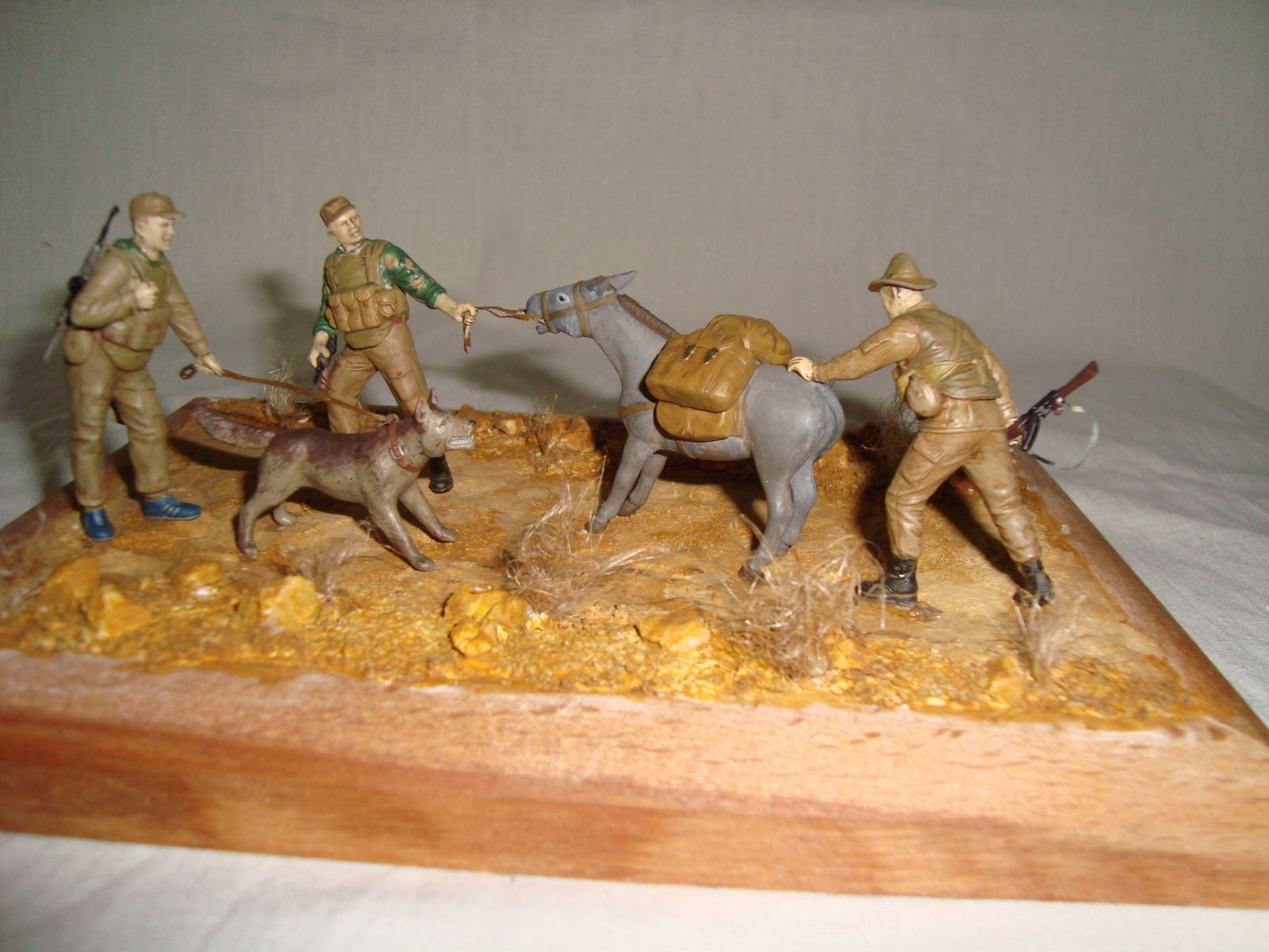 смывочки бы им и запылить...но, а так...вы же оружие в руках держали...у солдата, который стоит позади осла ремень не правдоподобно сделан. поводки должны быть натянуты в стуну...вес животных учитывайте. окраска норм, но я бы ослу заменил хвост.