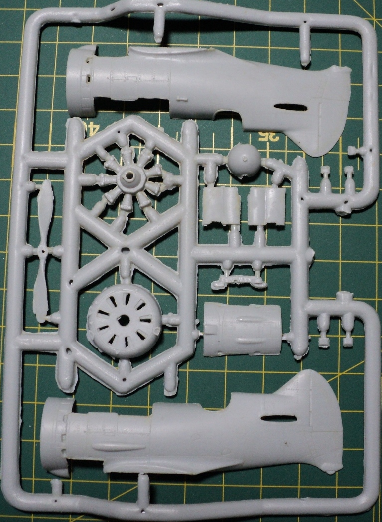 Модель представляет собой классическое амоделовское изделие с толстыми рамками литников и грубоватыми детальками, покрытыми облоем и заусеницами, лежащее в традиционной коробке-развалюшке.