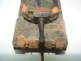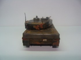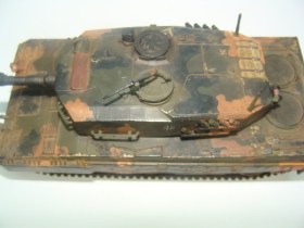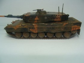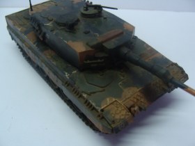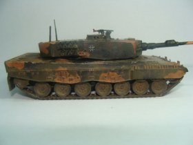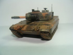 Выкладываю для общего обсуждения немецкий танк Leopard 2. Модель полностью собрана из коробки, никаких доработок нет. Красилась кистью, акрилом Tamiya. При сборке больших проблем не возникало, исходя из моих личных требований и количества опыта. Из явных косяков, видимых даже неопытным глазом: невысверленый ствол и незашпатлёваные на башне и корпусе швы. Не могу никак решиться на заказ соответствующих инструментов, а сходить и купить их просто нет возможности - модельных магазинов по близости не существует.