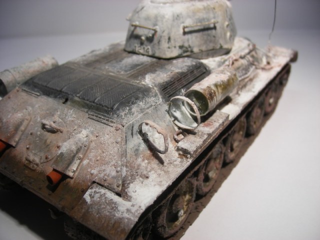 По матчасти Т-34 не спец, но собрано, на мой взгляд, неплохо. Окраска в зимний камо понравилась. Насчет грязи на катках - в принципе, по весенней распутице еще и не так ходовая уделается. А если бы поставить наборные гусеницы - модель смотрелась бы гораздо интереснее. Но все равно - зачет.