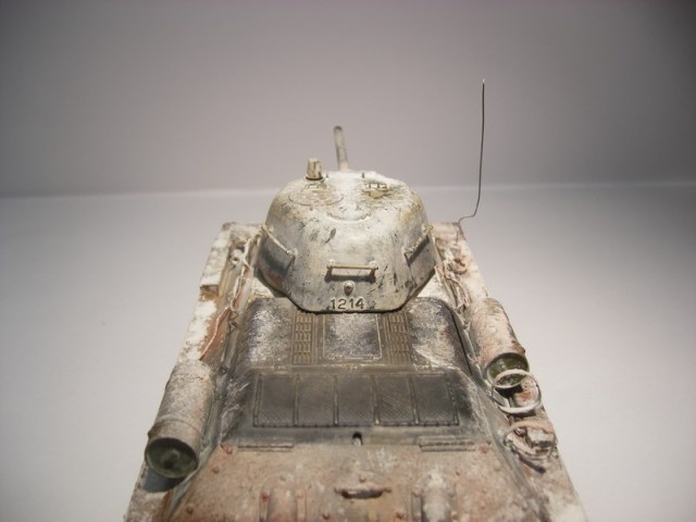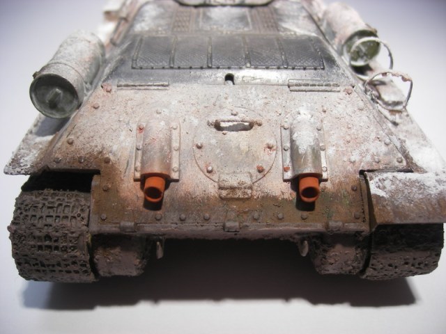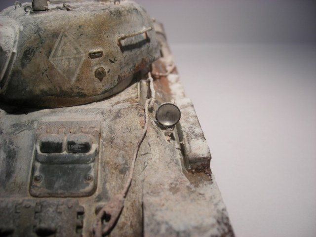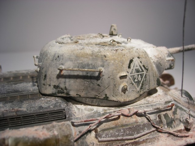 ...Соглашусь с предыдущим оратором,можно было сетку МТО сделать из ситечка,было бы реалистичней.Добавлю,что на "в хлам" загаженный танк нанесены тактические обозначения.выглядит немного странно.
