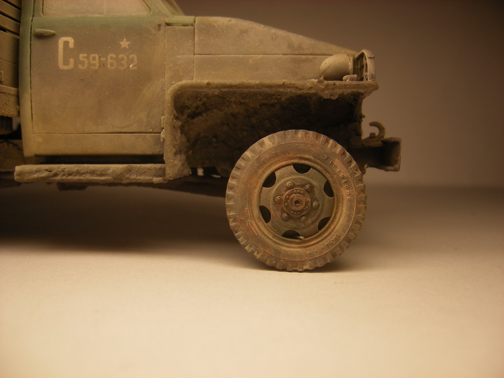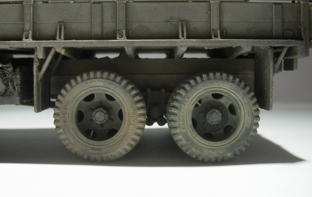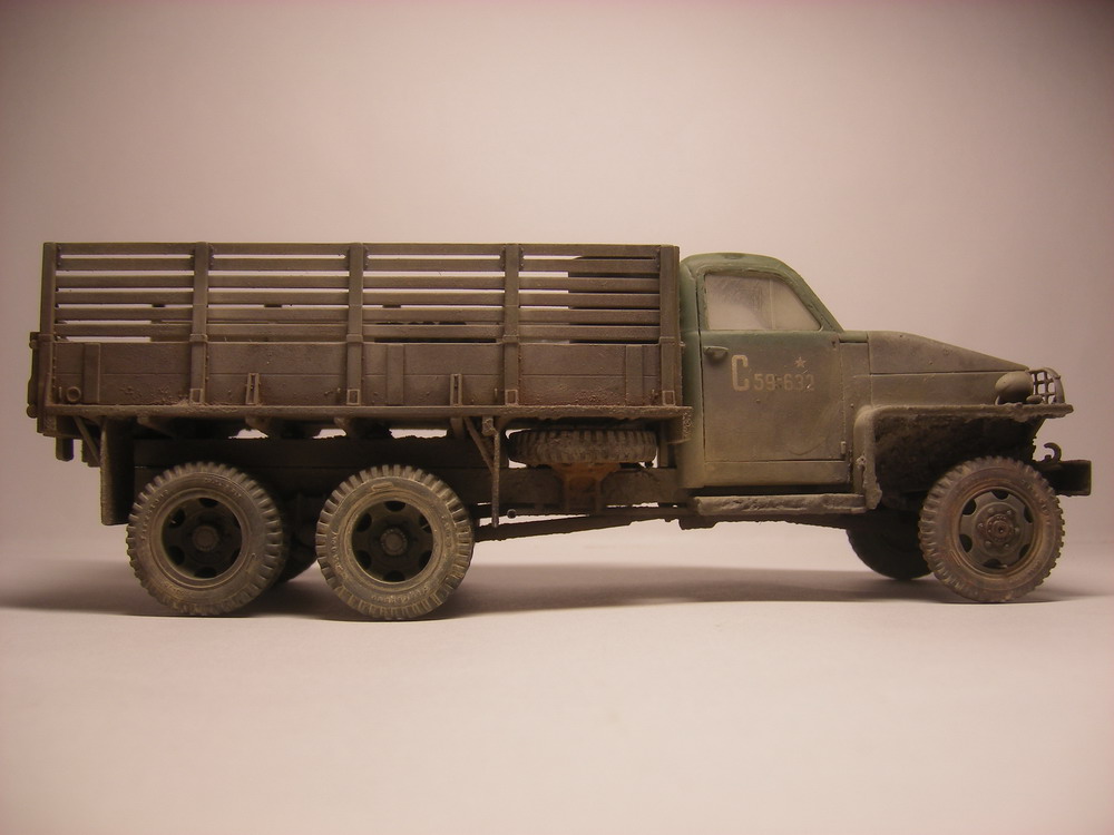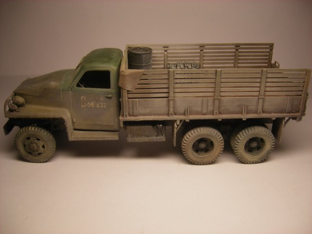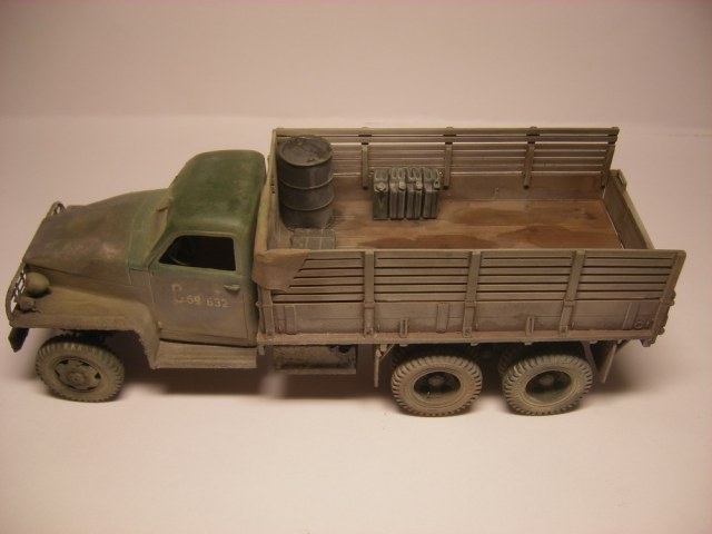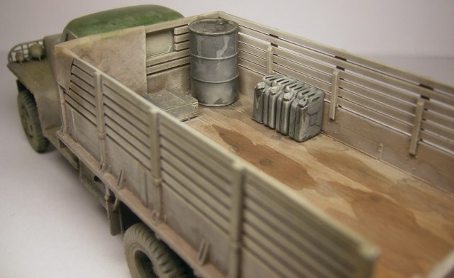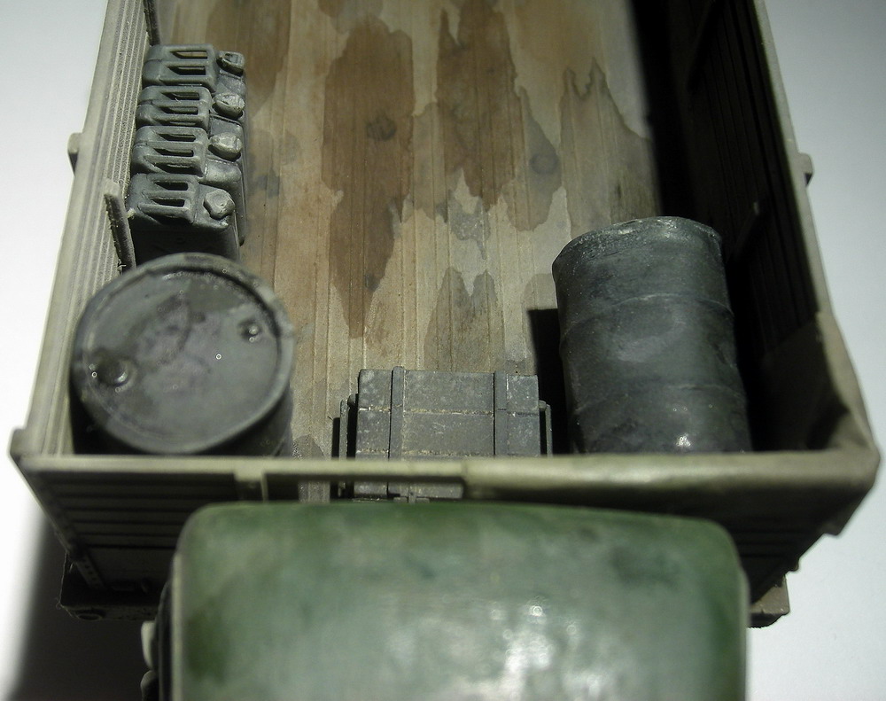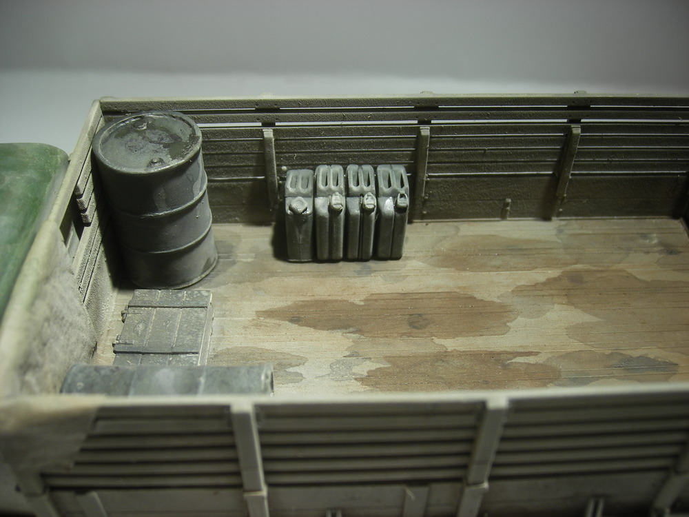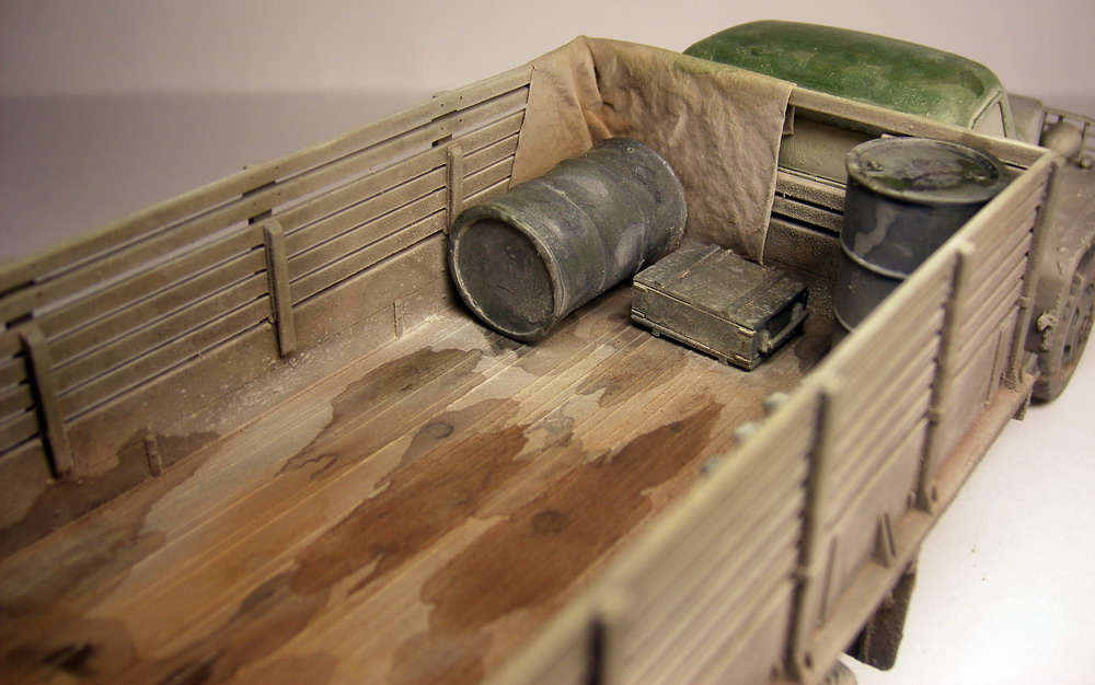 Запылил аэром (жидко разведенная тамия "буфф") и в конце пигменты миг. Канистры и бочки из запасников, брезент из салфетки, разводы в кузове жидко разведенная эмаль.