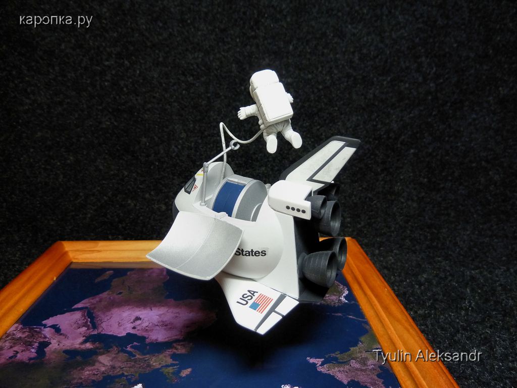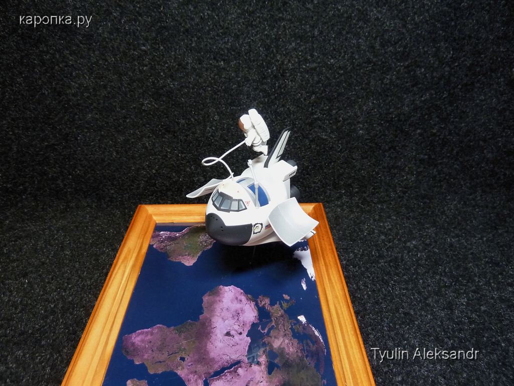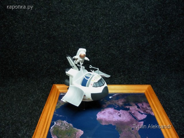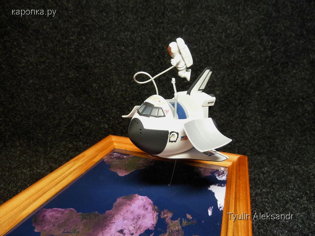 Вот решил отдохнуть от больших строек и склеить чё нить маленькое и не менее интересное для себя. Как всегда, не смотря на малое количество деталей, набор оказался весьма не прост. Дек в наборе, чуть ли не в два раза больше чем пластмассовых деталей. С некоторыми так и не справился, особенно это заметно на хвосте шатла. Больше трудностей при сборке не возникло. Доработок никаких, только шланг от корабля до астронавта сделал гофрированным.