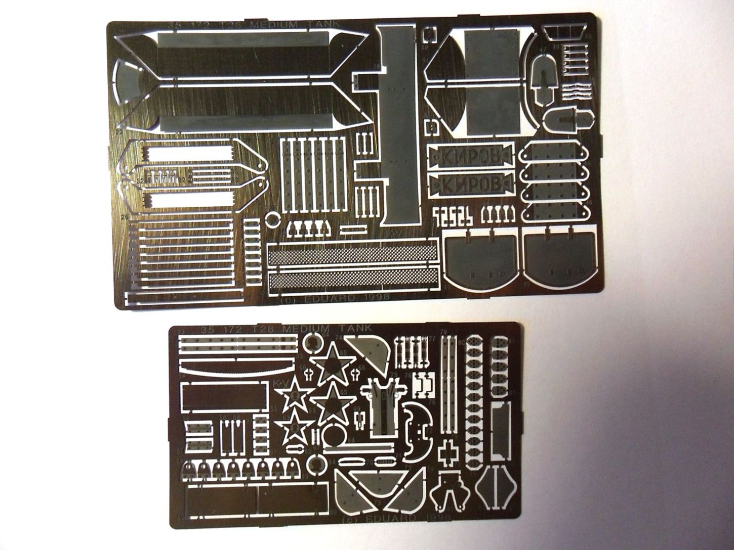 Платы фототравления включают ряд деталей корпуса, башни, крепления шанцевого инструмента, ящиков, крыльев, турели для зенитного пулемета и др., в том числе и звезды, приделывающиеся на крыше башни некоторых танков, а также надпись "Киров", украшавшая один из именных танков перед войной.