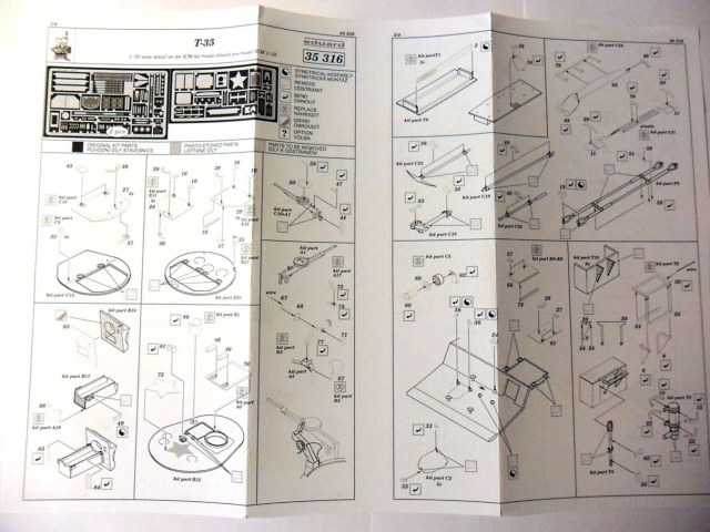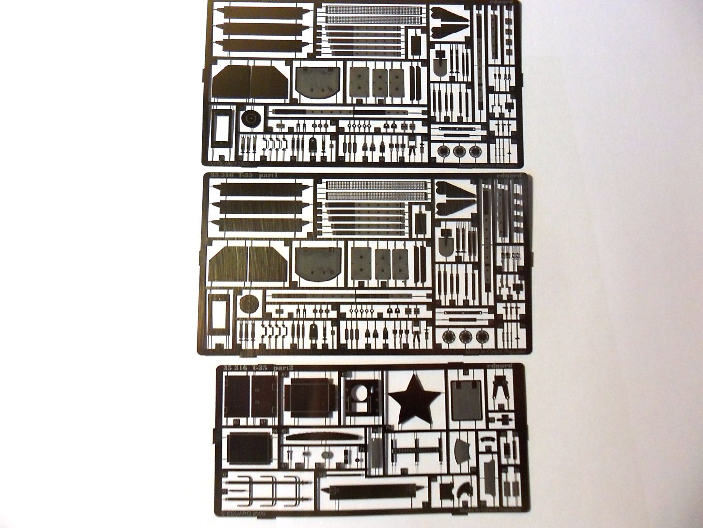 Набор травления позволяет детализировать крепления шанца, бортовых экранов, ящики и др. мелкие части конструкции. Также в наборе имеются травленные звезды различного размера, устанавливающиеся на крыше башни и корпусе машины, особенно на тех, которые участвовали в различных парадах.