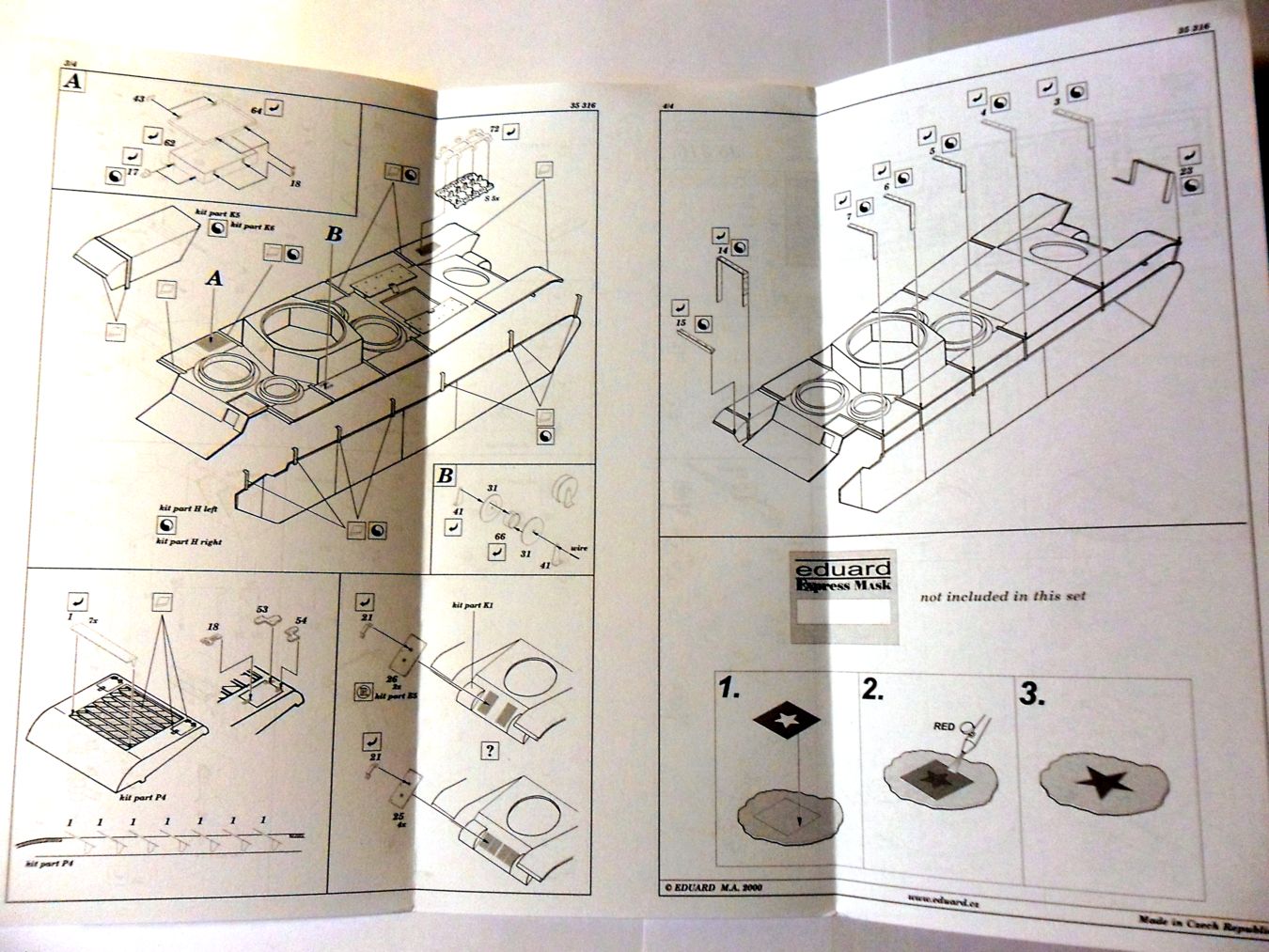 Набор упакован в присущей чехам манере, платы травления проложены плотным картоном. В наборе присутствуют: инструкция на одном листе, отпечатанная с двух сторон, и три платы фототравления из металла стального цвета.