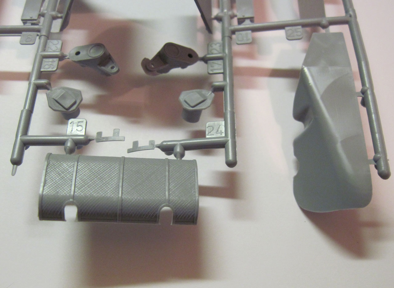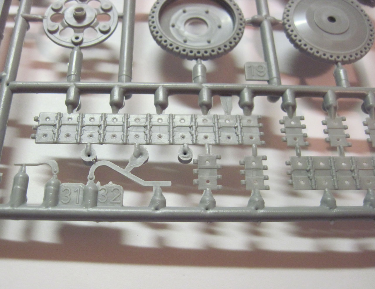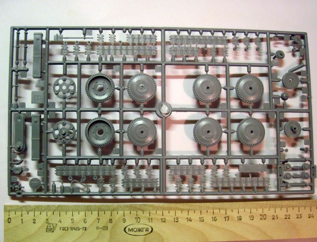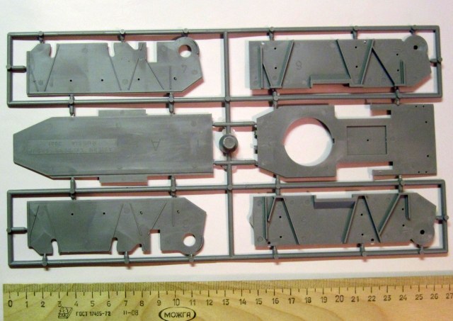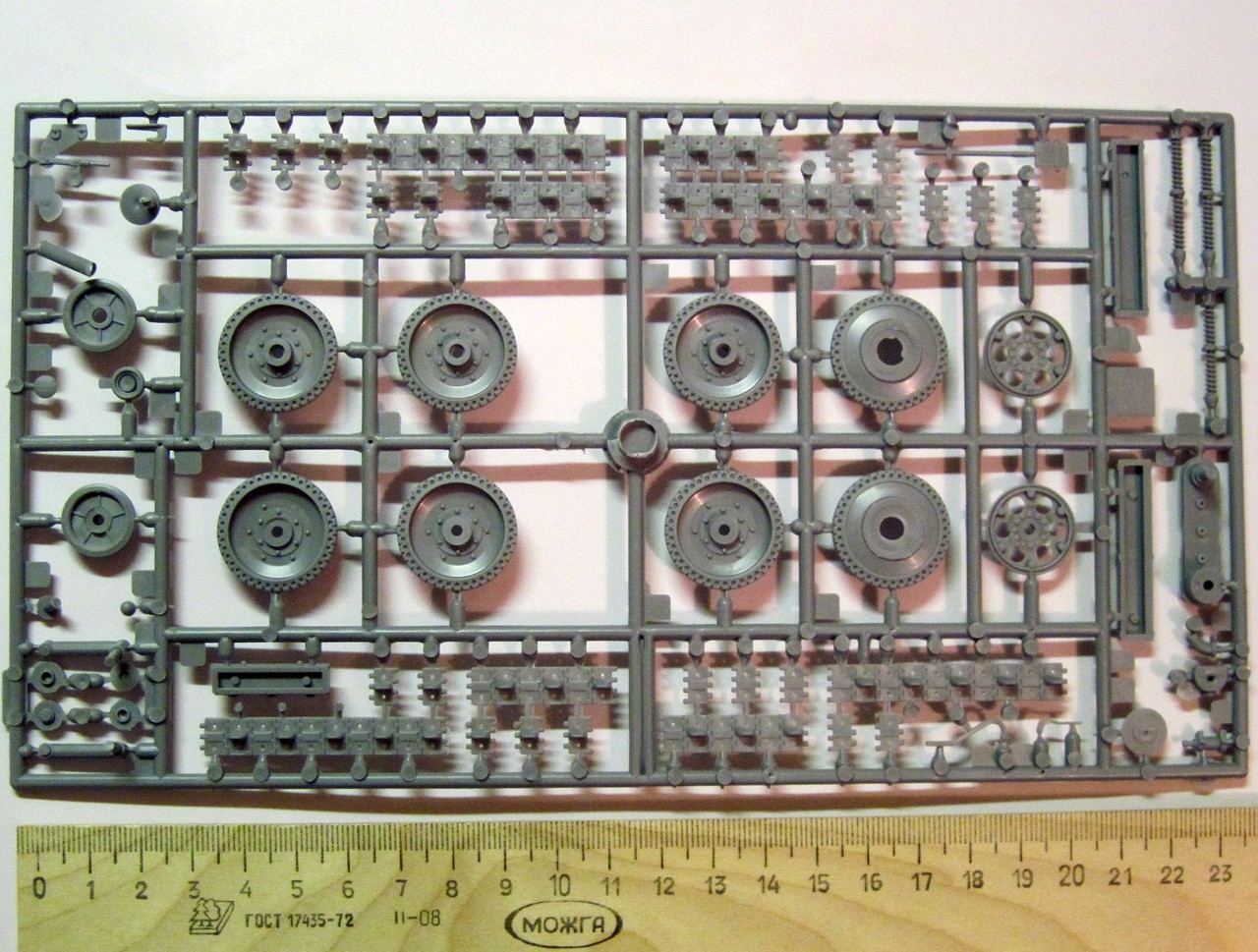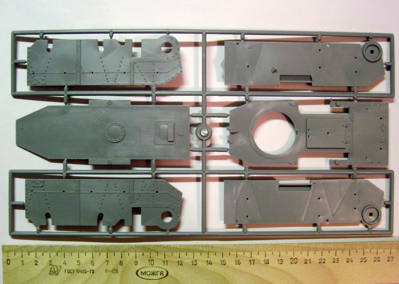 На первый взгляд набор производит положительное впечатление – детали отлиты довольно четка, присутствует облой, но он легко удаляется. Впрочем, исходя из опыта сборки модели КВ-1 от того же ВЭ, основной «засады» следует ожидать от сходимости деталей. Занятно, что в набор входит довольно богатая декаль, но в инструкции нет ни малейшего намека на то, что и куда клеить и что и чему соответствует – сплошная свобода для творчества. Схем окраски для модели в инструкции, как вы уже наверное догадались, тоже нет. Еще стоит отметит, что производитель предлагает с наборе фары «боевого света», но вот до их остекления деталями из прозрачного литника (равно как и до остекления основных фар) он не додумался, а жаль.
