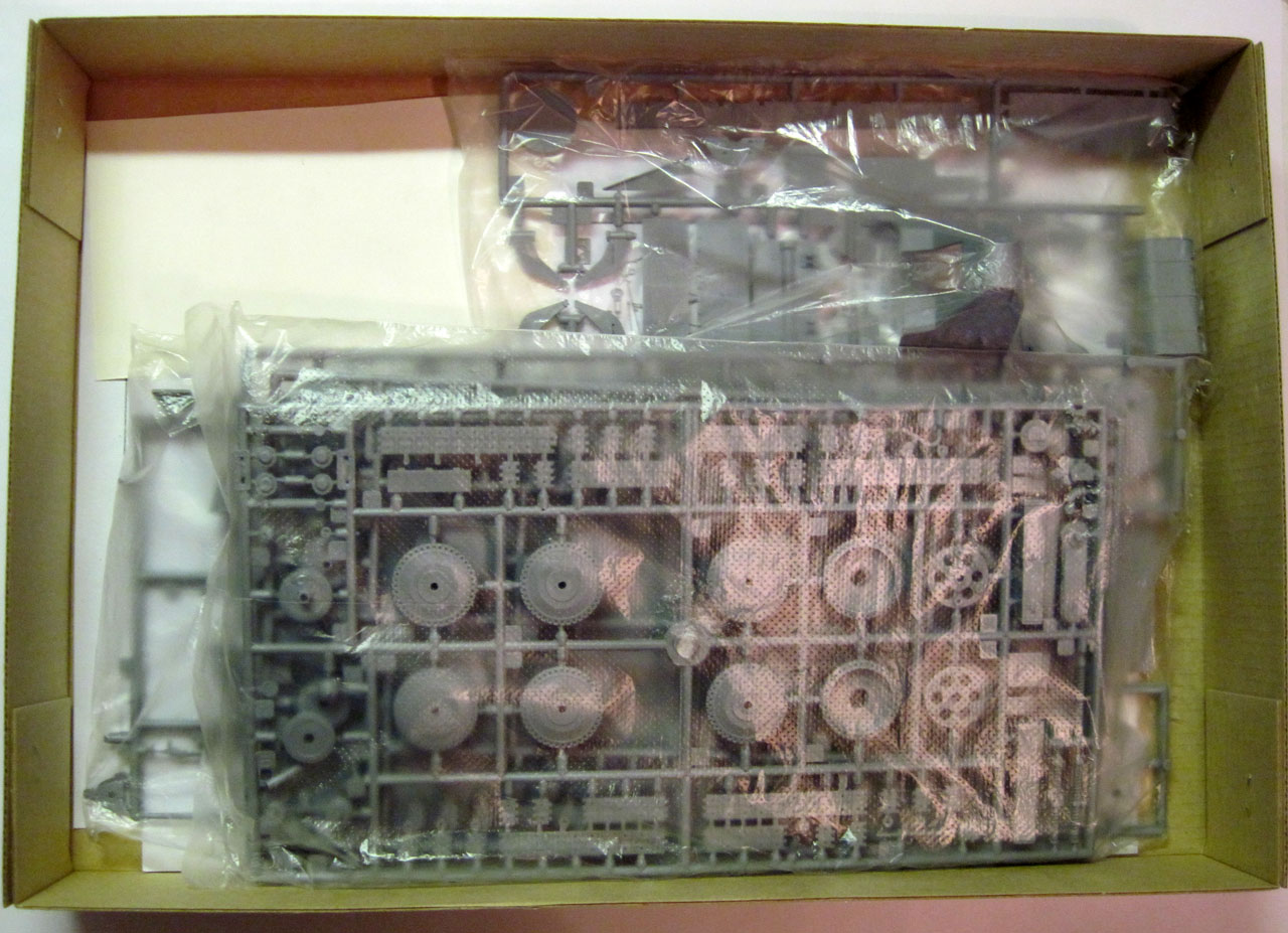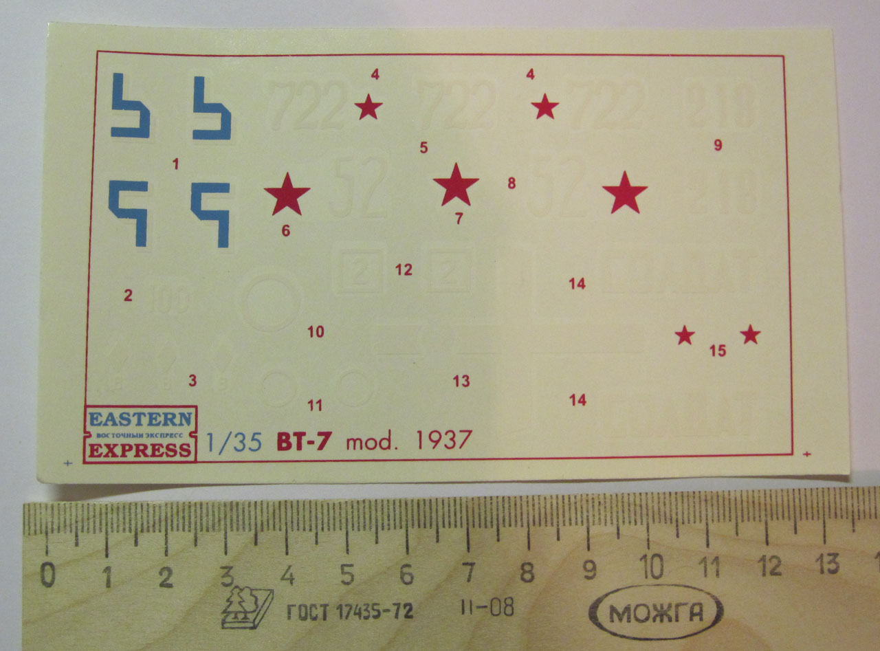 И так, вашему вниманию предлагается обзор модели танка БТ-7 обр. 1937 г. Ранняя версия от фирмы «Восточный Экспресс». Модель находится в коробке среднего размера (34,5×24×5 см.) на лицевой стороне которого помещена сцена из предположительно «освободительного» похода в Польшу в 1939 г. Внутри коробки нас ожидают три целлофановых пакетика с литниками (всего пять литников: два с деталями корпуса, два одинаковых литника с элементами ходовой и обвеса и один литник с деталями башни), декаль, и инструкция на двух листах формата А4.