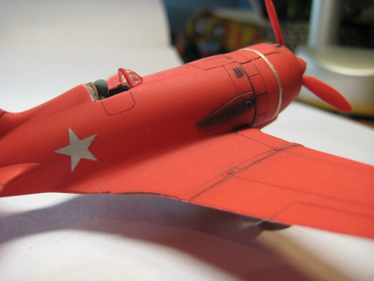 В целом модель понравилась.Учитывая качество А-Моделовского ЛНД,проделанная работа вызывает уважение.Окраска и выделение расшивки тоже проведены на достаточно высоком уровне.Исправление косяка хвостовой опоры,я думаю,займёт не больше часа.А вот необработанная задняя кромка крыла в районе центроплана по правому борту и небрежно смонтированный козырёк пилотской кабины огорчают.