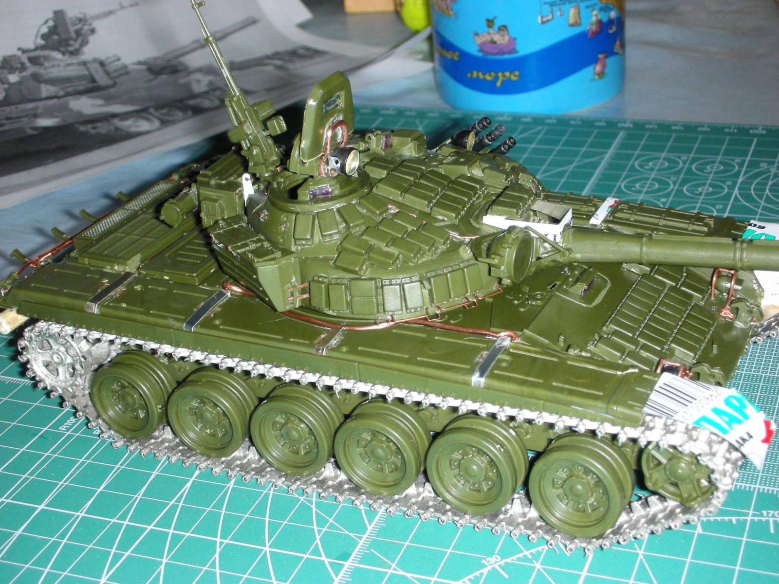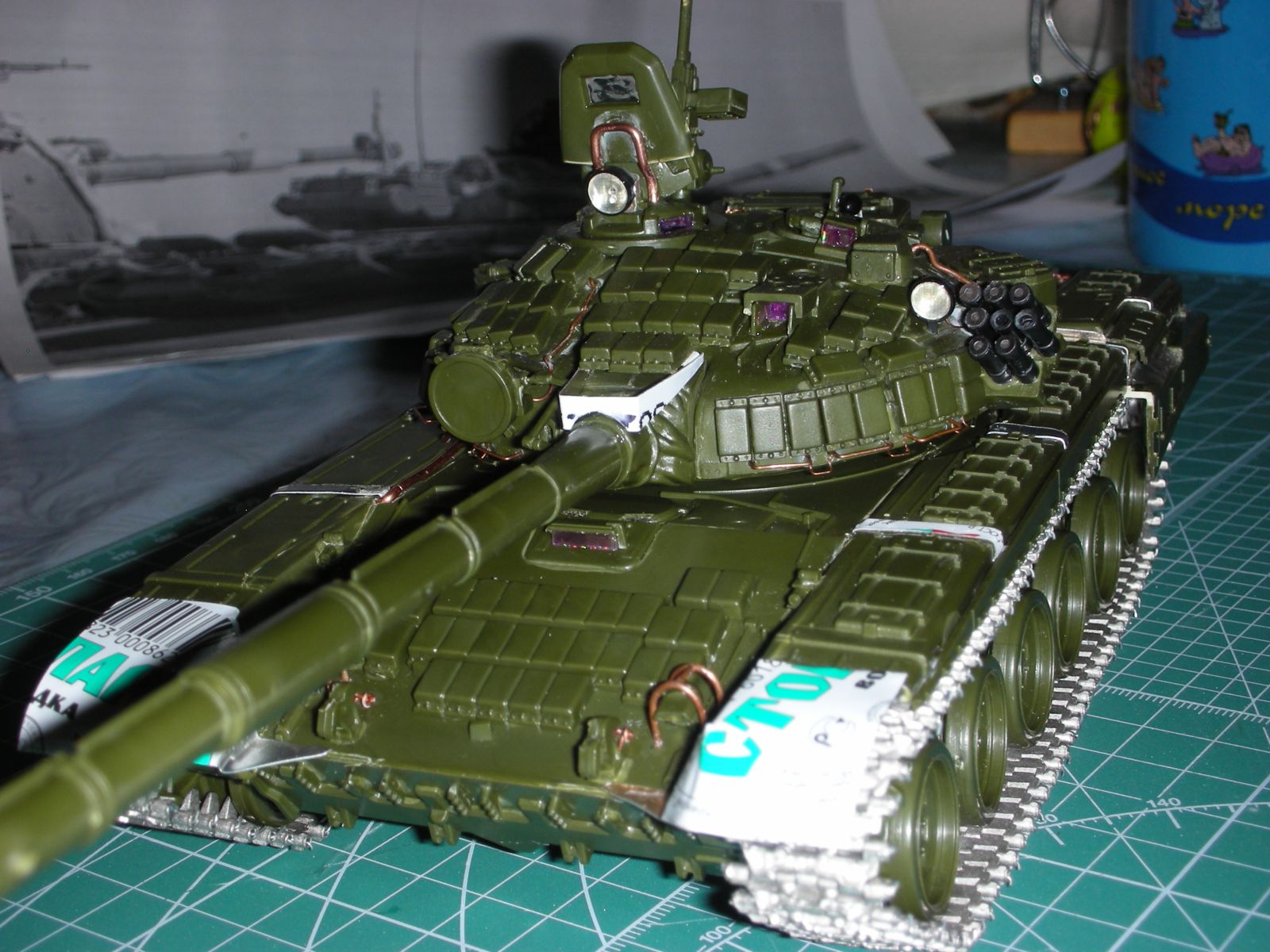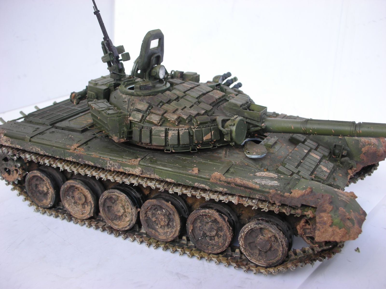 Всем здравствуйте, вот и подошла очередь очередного произведения моего искуства прошу сделать побольше коментариев т.к. в дальнейшем хочу задействовать в его в диараме. Использовал в создании траки friulmodel , 125мм пушка rbmodel, тримплексы из компакта, сделал разрывы и сколы на катках. ручки тросы хамуты проводка бензотрубки из проволоки, заменил передние брызговики или крылья (кому как), фары elf, грунт краски tamiya акан, вся химия mig