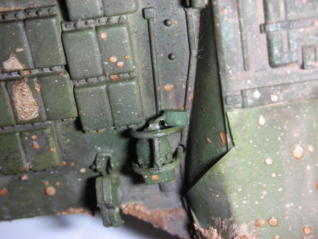 Саша , по мат. части уже сказали много , я бы посоветовал сделать заливку во все щели и углубления и пока рассматривал траки - пришла мысль , чтобы попробовать их собрать на английские булавки , головками на ружу , а то эти крючки-загибы как-то бросаются в глаза . Удачи !!!