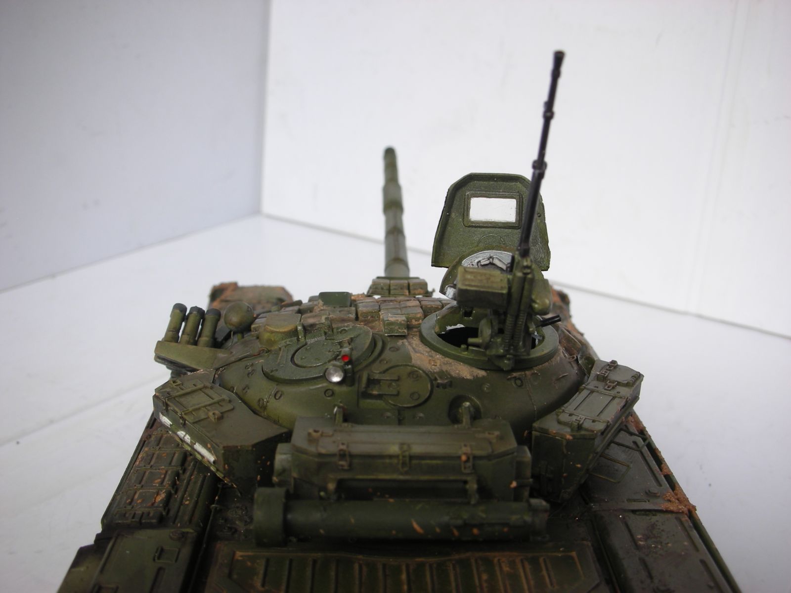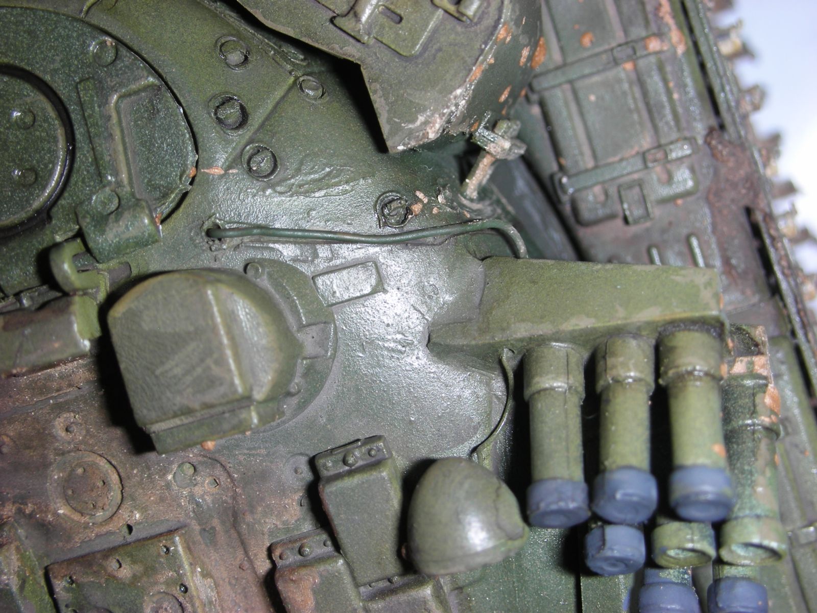 На башню необходима смывка! Таким белой внутренний окрас бывает только в день покраски. Крышки дымовых гранатометов обычно не красятся в цвет корпуса и остаются черными. Непонятно что за скобы по нижнему периметру башни. Если это кроншнейны куда вешают блоки ДЗ для защиты погона башни, то они выглядят так: